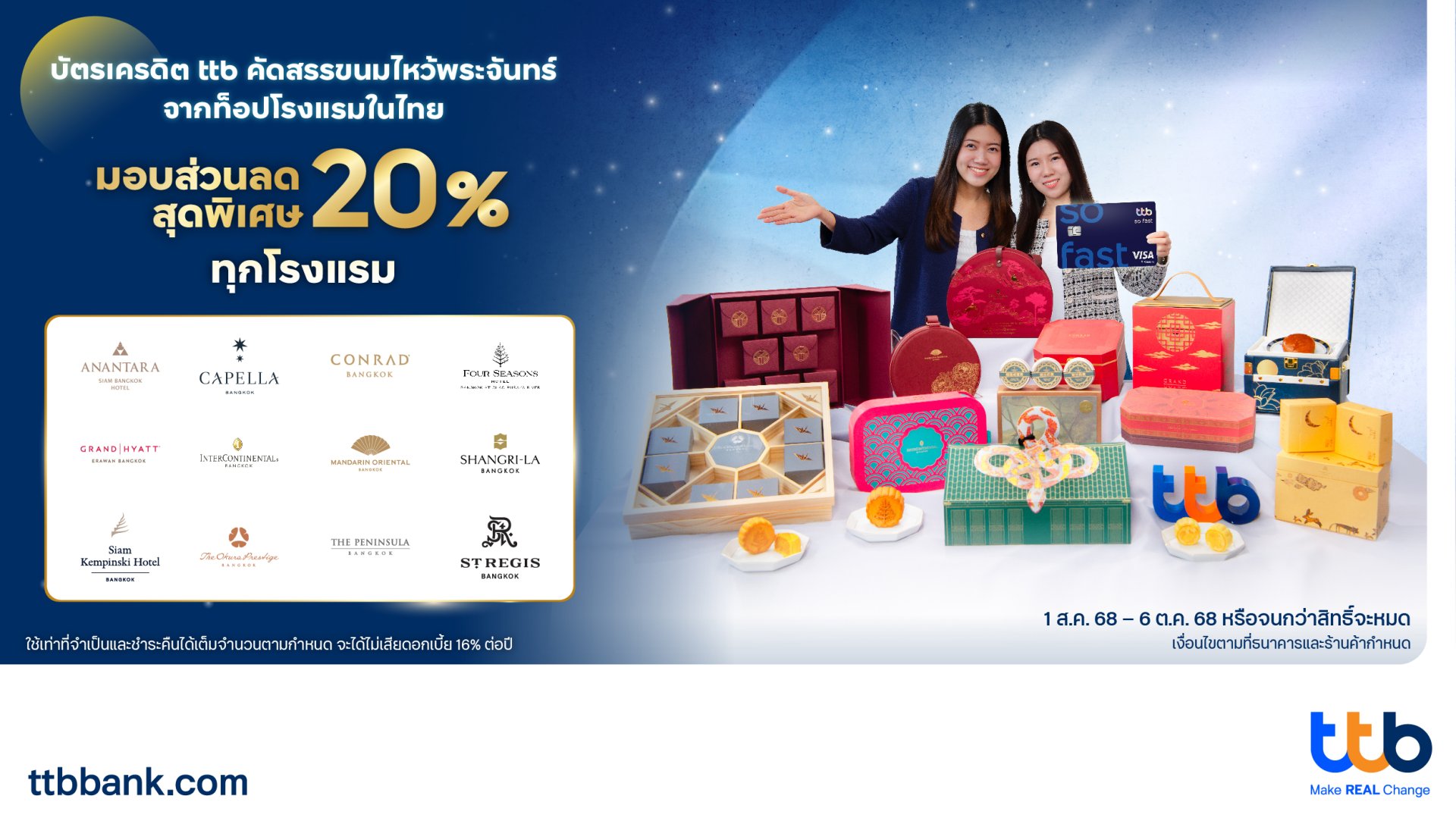 ทีเอ็มบีธนชาต หรือ ทีทีบี ร่วมฉลองเทศกาลไหว้พระจันทร์ส่งมอบความสุข ความอร่อย โดยคัดสรรขนมไหว้พระจันทร์สุดพรีเมียม จาก 12 โรงแรมชั้นนำของประเทศไทย พร้อมรับส่วนลด 20% เฉพาะผู้ถือบัตรเครดิต ttb บัตรเครดิต ttb Global House และบัตรเครดิต ttb Disney แบบไม่มีขั้นต่ำ จาก 12 โรงแรมชั้นนำในประเทศไทย ได้แก่ Mandarin Oriental Bangkok, Grand Hyatt Erawan Bangkok, InterContinental Bangkok, Shangri-La Bangkok, The Peninsula Bangkok, Anantara Siam Bangkok Hotel, Siam Kempinski Hotel Bangkok, The Okura Prestige Bangkok, Capella Bangkok, Conrad Bangkok, Four Seasons Hotel Bangkok at Chao Phraya River และ The St. Regis Bangkok ตั้งแต่วันที่ 1 สิงหาคม - 6 ตุลาคม 2568 ศึกษารายละเอียดเพิ่มเติมของโปรโมชัน ได้ที่ https://www.ttbbank.com/th/promotion/credit-card/dining/mooncake-aug25