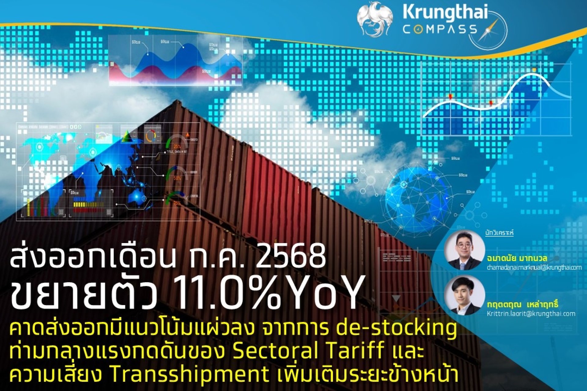 Krungthai COMPASS มองว่าแม้การส่งออกจะได้อานิสงค์จากการ Front-loading ช่วงที่ผ่านมา แต่ตัวเลขการส่งออกล่าสุดในเดือน ก.ค. ที่หดตัว 0.24%MoM ติดลบต่อเนื่องเป็นเดือนที่ 2 บ่งชี้ถึงแรงส่งที่อ่อนแอลงและจะทยอยชัดขึ้นระยะข้างหน้า ทั้งการเก็บ Sectoral Tariff ในสินค้าบางกลุ่มเพิ่มเติม แนวทางการจัดเก็บ Transshipment Tariff ที่ยังไม่ชัด การ de-stocking สินค้าที่เคยเร่งนำเข้า รวมถึงการแย่งตลาดส่งออกใหม่ทดแทนสหรัฐฯ ซึ่งปัจจัยเหล่านี้ล้วนกดดันการส่งออกของไทยในระยะถัดไป