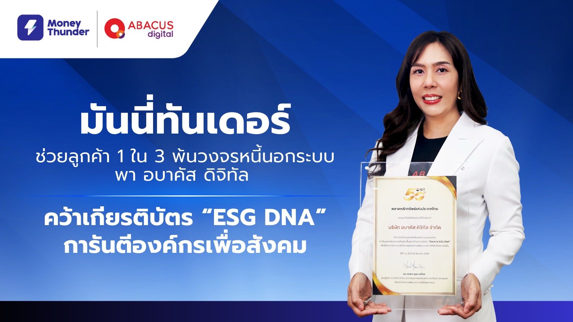 มันนี่ทันเดอร์ช่วยลูกค้า 1 ใน 3 พ้นวงจรหนี้นอกระบบ พา อบาคัส ดิจิทัล คว้าเกียรติบัตร ESG DNA การันตีองค์กรเพื่อสังคม