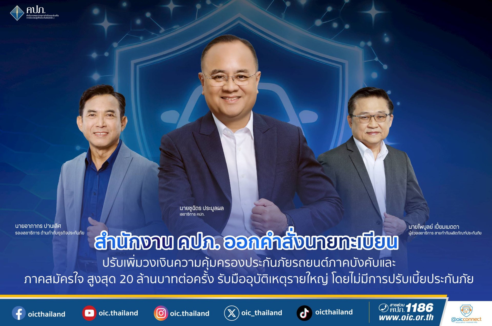 สำนักงาน คปภ. ออกคำสั่งนายทะเบียน ปรับเพิ่มวงเงินความคุ้มครองประกันภัยรถยนต์ภาคบังคับและภาคสมัครใจ สูงสุด 20 ล้านบาทต่อครั้ง รับมืออุบัติเหตุรายใหญ่ โดยไม่มีการปรับเบี้ยประกันภัย