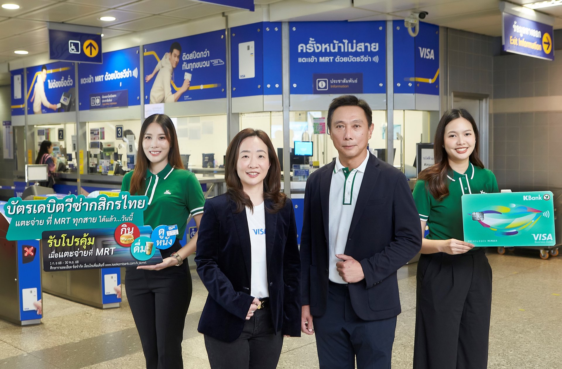 นอกจากนี้ธนาคารกสิกรไทย ยังมอบโปรโมชันพิเศษ คุ้มติดสปีด สำหรับลูกค้าที่ใช้บัตรเดบิตวีซ่ากสิกรไทยแตะจ่ายค่าโดยสารรถไฟฟ้า MRT ทุกสาย ตั้งแต่วันที่ 1 กันยายน 2568 30 พฤศจิกายน 2568 อีกด้วย โดยลูกค้าปัจจุบันที่ใช้บัตรเดบิตวีซ่ากสิกรไทยแตะจ่ายค่าโดยสารรถไฟฟ้า สามารถรับฟรี เมนูเครื่องดื่ม หรือตั๋วชมภาพยนตร์ เพียงลงทะเบียนเข้าร่วมแคมเปญผ่านทาง Line @kbanklive และใช้แตะจ่ายตามเงื่อนไขดังนี้