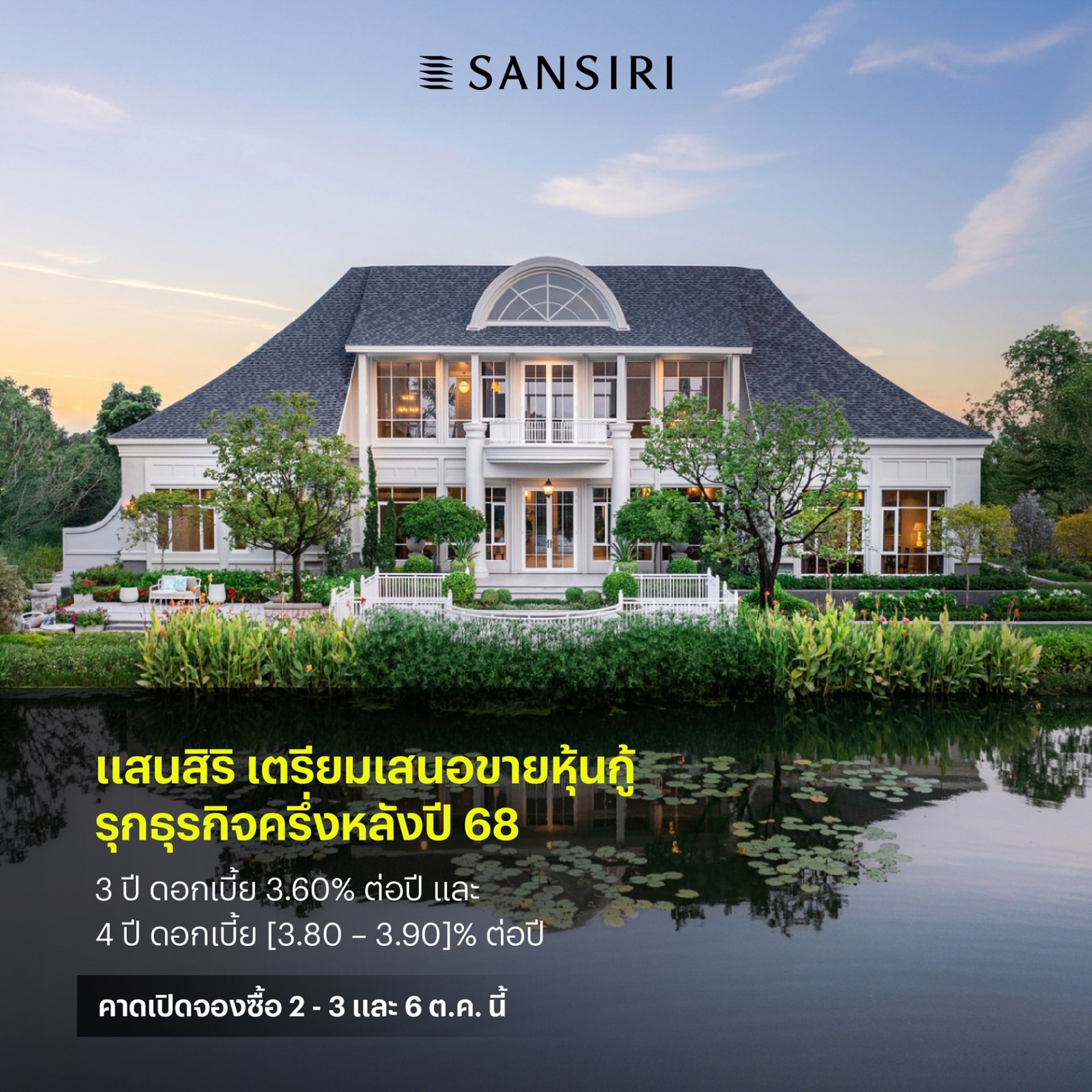 แสนสิริ เตรียมออกหุ้นกู้ชุดใหม่ รุกแผนธุรกิจครึ่งหลังปี 68 ชูดอกเบี้ยระหว่าง [3.603.90]% ต่อปี คาดเสนอขาย 2 - 3 และ 6 ตุลานี้