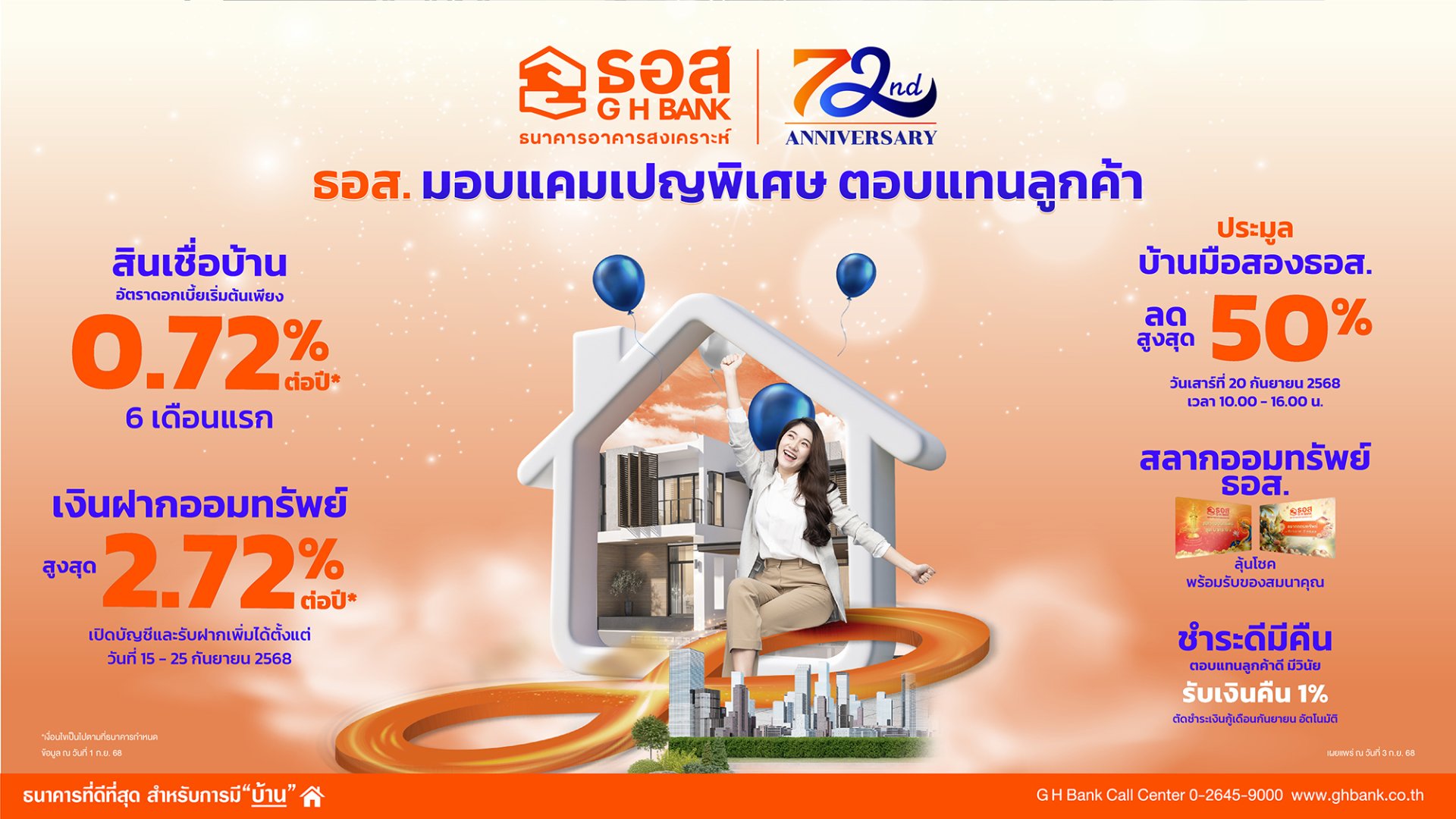 ธอส. ฉลองครบ 6 รอบ 72 ปี จัดเต็มแคมเปญพิเศษตอบแทนลูกค้า นำโดยสินเชื่อบ้านดอกเบี้ยต่ำ 0.72% ต่อปี เงินฝากดอกเบี้ยสูงสุด 2.72% ต่อปี