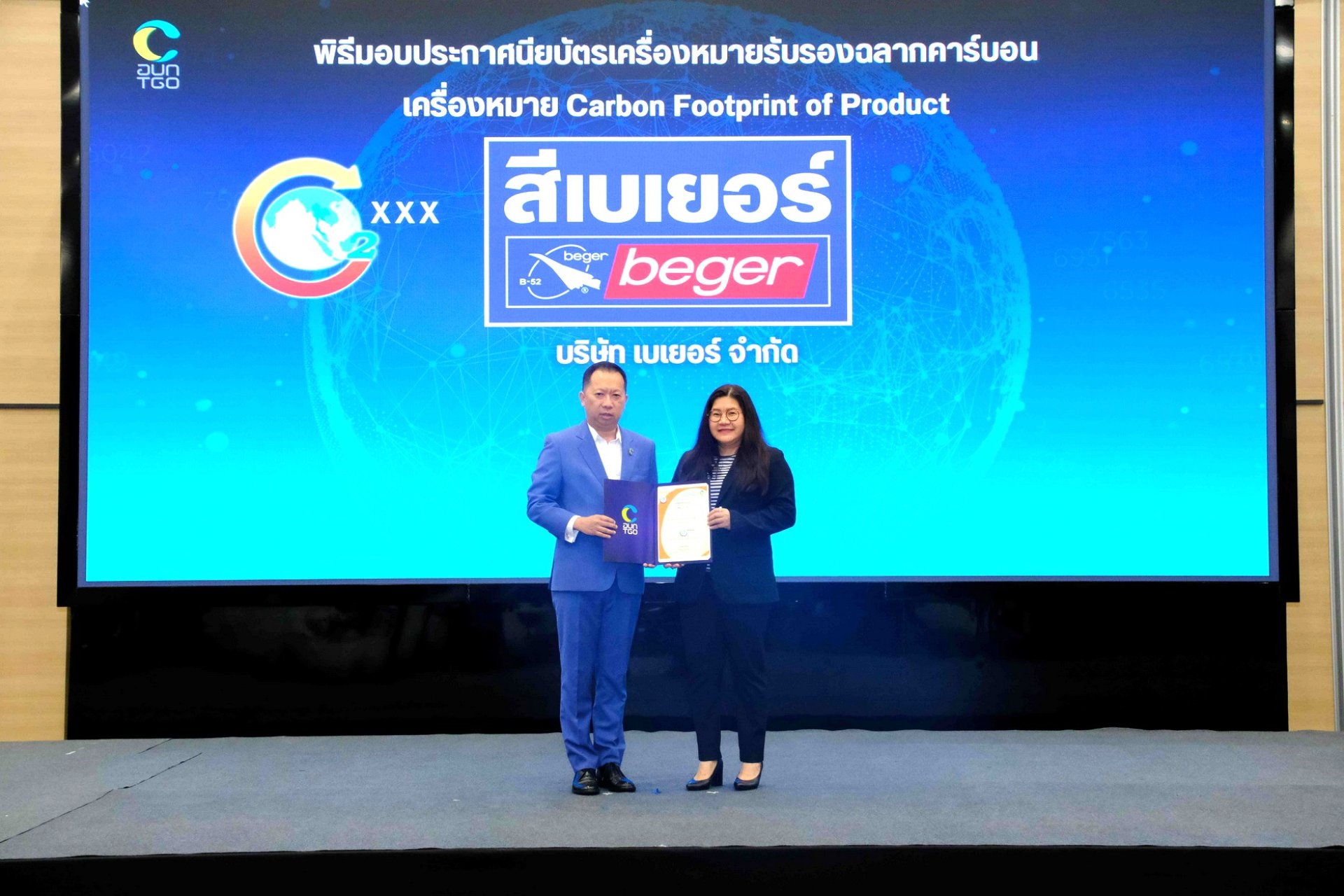 บริษัท เบเยอร์ จำกัด เดินหน้ายกระดับมาตรฐานธุรกิจสีรักษ์โลก ล่าสุด ดร.จารุรัตน์ ชัยยศบูรณะ ผู้บริหารกลุ่มบริษัทสีเบเยอร์ เข้ารับมอบ ประกาศนียบัตรฉลากคาร์บอน ประเภทคาร์บอนฟุตพริ้นท์ของผลิตภัณฑ์ (Carbon Footprint of Product : CFP) จากองค์การบริหารจัดการก๊าซเรือนกระจก (องค์การมหาชน) หรือ อบก. ในพิธีมอบประกาศนียบัตรฯ เมื่อวันที่ 8 กันยายน 2568 ณ สถาบันเพื่อการยุติธรรมแห่งประเทศไทย (TIJ) ถนนแจ้งวัฒนะ