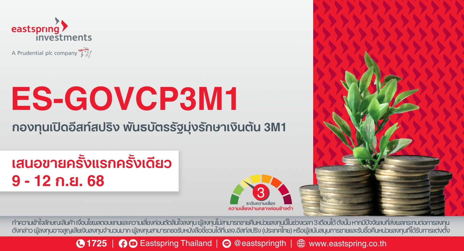 บริษัทหลักทรัพย์จัดการกองทุน อีสท์สปริง (ประเทศไทย) จำกัด หรือ บลจ.อีสท์สปริง เปิดเสนอขายกองทุนเปิดอีสท์สปริง พันธบัตรรัฐมุ่งรักษาเงินต้น 3M1 (ES-GOVCP3M1) อายุประมาณ 3 เดือน เงินทุนโครงการ 7,000 ล้านบาท ซึ่งเป็นกองทุนรวมตราสารหนี้ที่มุ่งรักษาเงินต้นที่ผู้ลงทุนจะมีโอกาสได้รับเงินต้นคืนเต็มจำนวน และมีโอกาสได้รับผลตอบแทนเพิ่มจากการเพิ่มขึ้นของมูลค่าหน่วยลงทุน ณ วันครบอายุโครงการ โดยเสนอขายครั้งแรกครั้งเดียวตั้งแต่วันที่ 9-12 กันยายน 2568 ด้วยเงินลงทุนขั้นต่ำเพียง 1,000 บาท