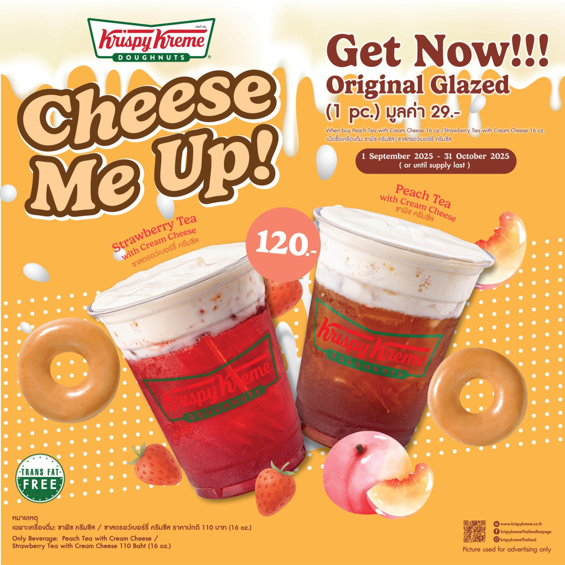 สัมผัสความหอมสดชื่นเต็มรสผลไม้ไปกับ Krispy Kreme Cheese Me Up! พร้อมจับคู่ความอร่อย คูณสอง เมื่อซื้อเครื่องดื่ม Krispy Kreme Cheese Me Up! เมนูใดก็ได้ 1 แก้ว และโดนัท คริสปี้ ครีม ออริจินอล เกลซ 1 ชิ้น ในราคาเพียง 120 บาท ได้ตั้งแต่วันที่ 1 กันยายน - 31 ตุลาคม 2568 ณ ร้านคริสปี้ ครีม 26 สาขาที่ร่วมรายการเท่านั้น