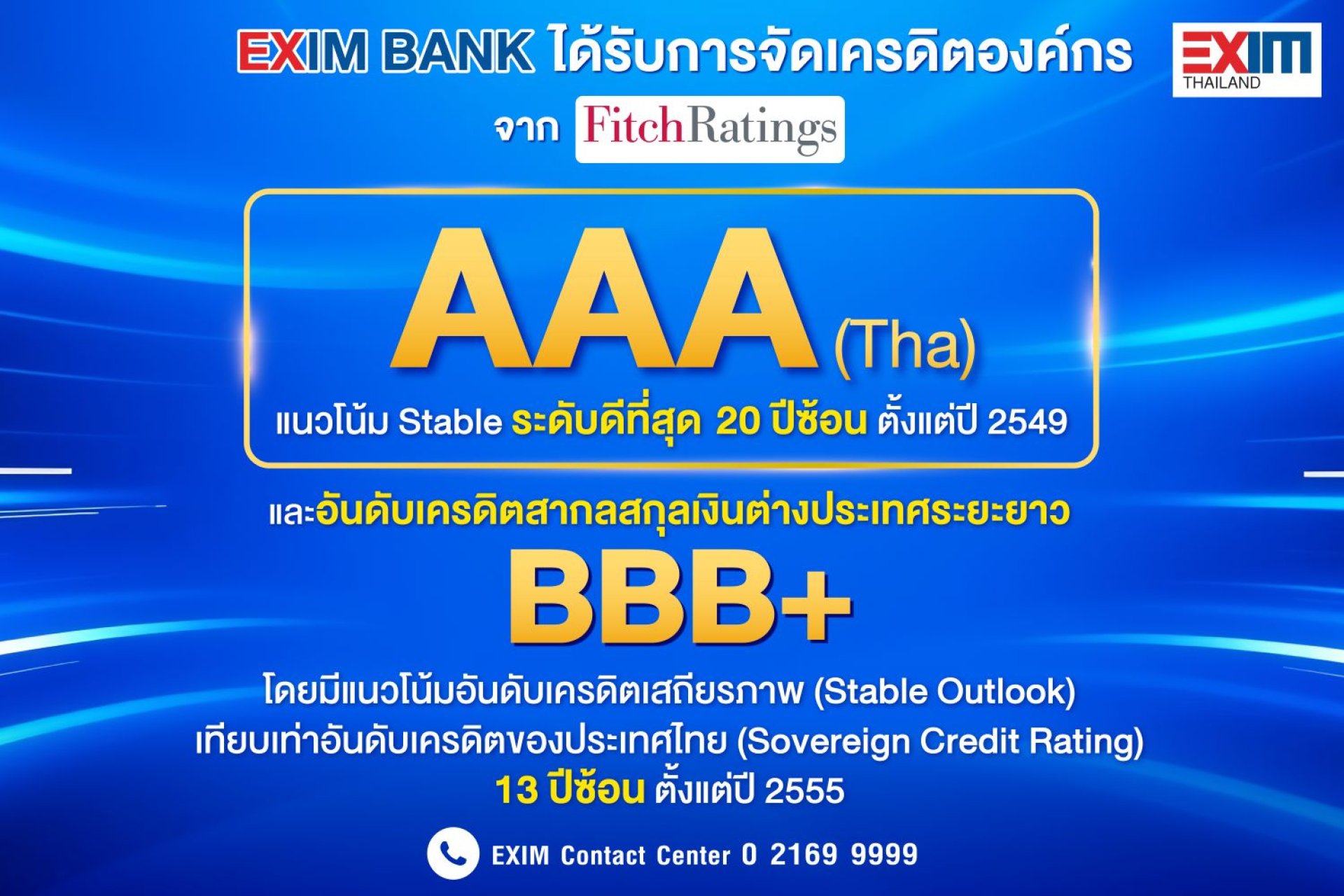 EXIM BANK โชว์สถานะทางการเงินแข็งแกร่ง คงอันดับเครดิตสูงสุดในประเทศ ระดับ AAA(tha) ต่อเนื่องเป็นปีที่ 20 และอันดับเครดิตสากลสกุลเงินต่างประเทศระยะยาวที่ BBB+เท่ากับประเทศไทย ต่อเนื่องเป็นปีที่ 13
