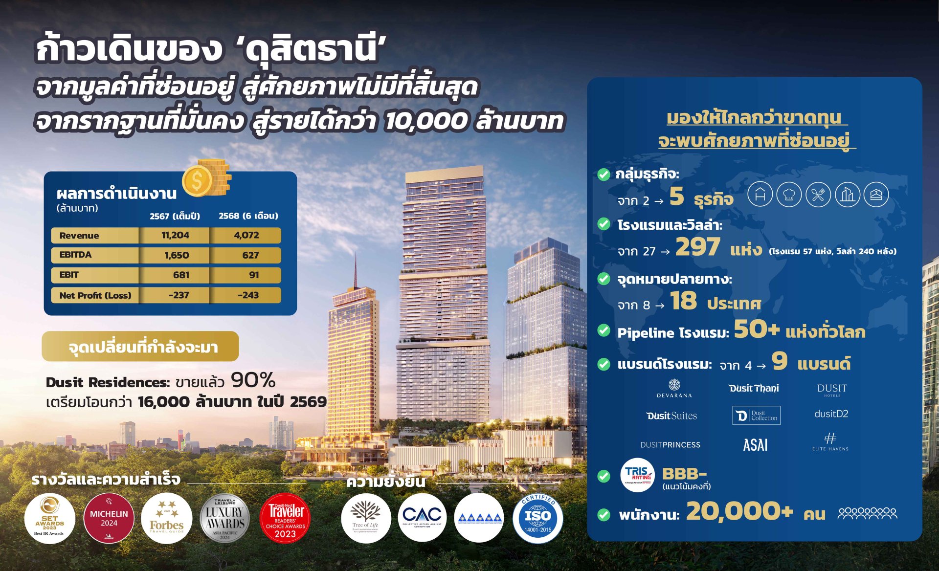 สำหรับการดำเนินงานของกลุ่มดุสิตธานีหลังจากนี้ จะไม่มีอะไรเปลี่ยนแปลงจากแผนงานเดิมที่ได้ถูกวางรากฐานไว้อย่างมั่นคงตลอดระยะเวลาเกือบ 10 ปีที่ผ่านมา ไม่ว่าจะเป็นธุรกิจโรงแรม ธุรกิจการศึกษา ธุรกิจอาหาร และธุรกิจอสังหาริมทรัพย์ รวมถึงโครงการ ดุสิต เซ็นทรัล พาร์ค (Dusit Central Park) มูลค่ากว่า 46,000 ล้านบาท ที่จะเดินหน้าสร้างการเติบโตอย่างแข็งแกร่งตามเป้าหมายเดิมที่วางไว้ ด้วยทีมบุคลากรที่มีคุณภาพของกลุ่มดุสิตธานีที่ยังคงทุ่มเททำงานอย่างเต็มกำลังเหมือนที่ผ่านมา ดังนั้น ขอให้ผู้ลงทุน ลูกค้า คู่ค้า พันธมิตรทางธุรกิจ รวมถึงทุกส่วนที่เกี่ยวข้อง มั่นใจและเชื่อมั่นในสิ่งที่ ดุสิตธานี ดำเนินการมาโดยตลอด
