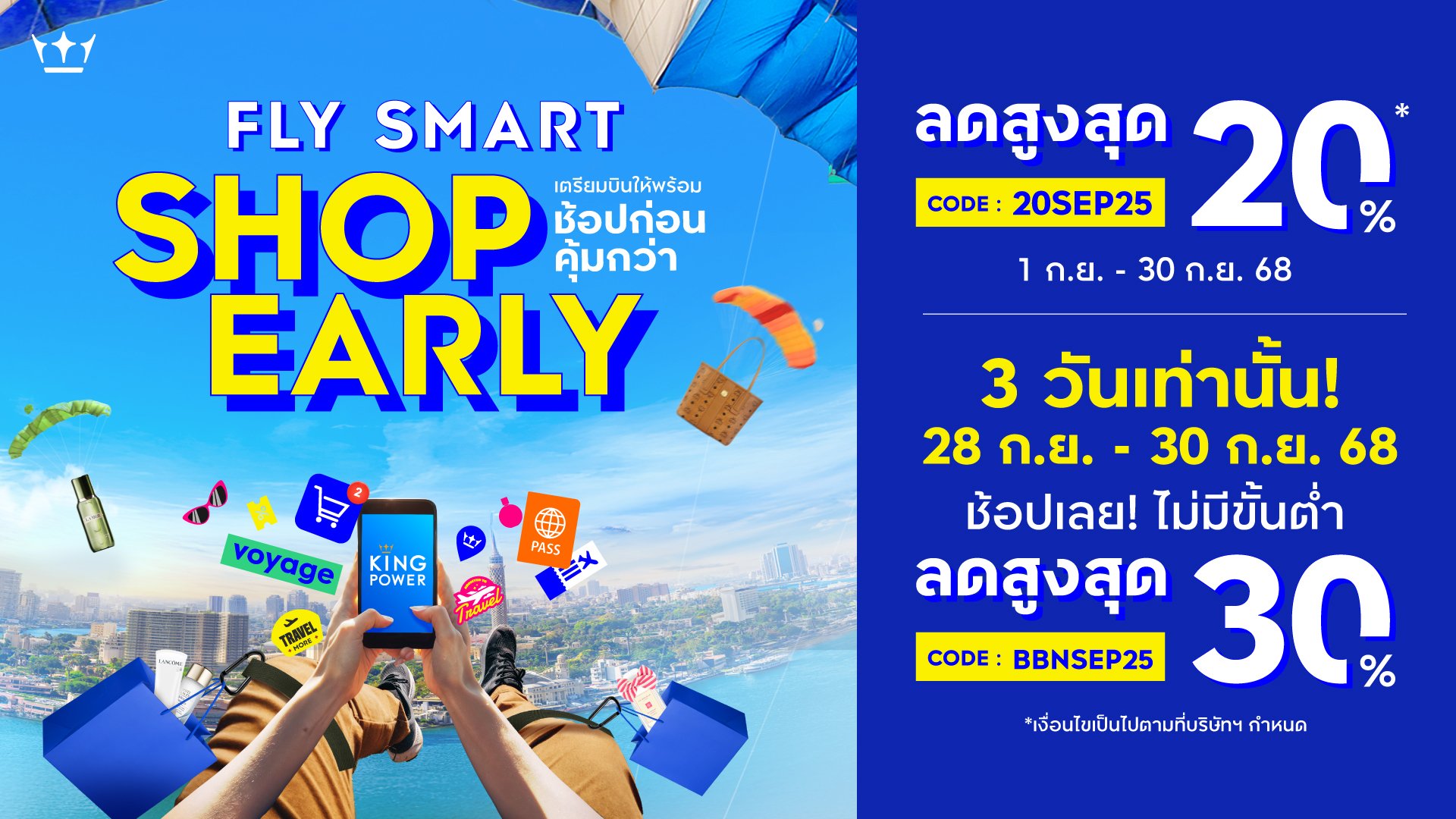 คิง เพาเวอร์ ออนไลน์ จัดแคมเปญเอาใจนักเดินทาง Fly Smart, Shop Early - เตรียมบินให้พร้อม ช้อปก่อนคุ้มกว่า! พบกับสินค้าจากแบรนด์ชั้นนำระดับโลก อาทิ MCM, POLO RALPH LAUREN, FERRAGAMO, TUMI, SAINT LAURENT, LACOSTE, COCCINELLE, MARC JACOBS และอีกมากมาย รับส่วนลดสูงสุด 20% เมื่อช้อปครบ 7,000 บาทขึ้นไป เพียงใส่รหัส 20SEP25 ช้อปคุ้มถูกใจ ตั้งแต่วันนี้ 30 กันยายน 2568