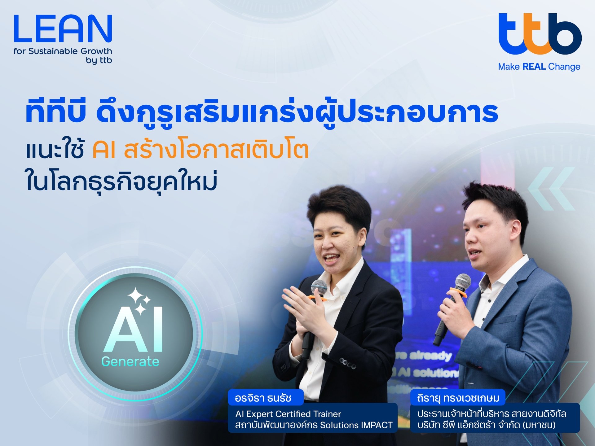 ทีเอ็มบีธนชาต หรือ ทีทีบี พร้อมเป็นพันธมิตรช่วยยกระดับศักยภาพภาคธุรกิจไทย เตรียมพร้อมรับมือในโลกธุรกิจยุคใหม่ ด้วยหัวข้ออบรมในหลักสูตร LEAN for Sustainable Growth by ttb รุ่นที่ 20 เสริมองค์ความรู้ด้าน AI สำหรับผู้ประกอบการอุตสาหกรรมอาหาร-เครื่องดื่ม-สินค้าอุปโภคบริโภค พร้อมแชร์ประสบการณ์ตรงจากธุรกิจที่ประสบความสำเร็จ หนุนสร้างโอกาสการเติบโตอย่างยั่งยืน