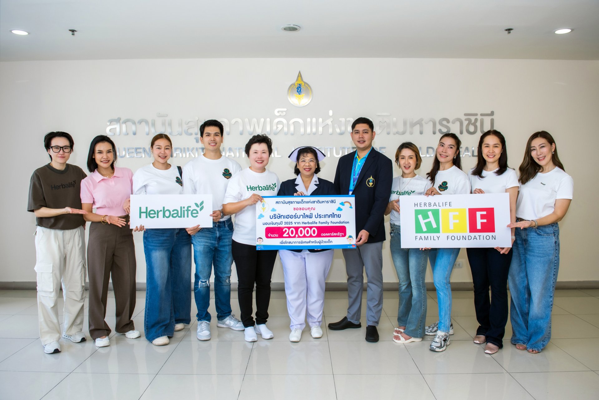 ภายในงาน ทีมผู้บริหาร พนักงาน และอาสาสมัครเฮอร์บาไลฟ์ ประเทศไทย นำโดย ดร.ภญ.วิภาดา แซ่เล้า ผู้จัดการอาวุโสฝ่ายการศึกษาและฝึกอบรมด้านโภชนาการ เฮอร์บาไลฟ์ เอเชียแปซิฟิก เป็นตัวแทนมอบเงินสนับสนุนเพื่อโภชนาการพิเศษสำหรับผู้ป่วยเด็ก ประจำปี 2568 จำนวน 20,000 ดอลลาร์สหรัฐ (ประมาณ 640,800 บาท) ให้แก่ผู้ป่วยเด็กภายใต้การดูแลของมูลนิธิจำนวน 300 คน โดยมีตัวแทนสถาบันสุขภาพเด็กแห่งชาติมหาราชินี ได้แก่ คุณศิริลักษณ์ ถาวรวัฒนะ รักษาการรองผู้อำนวยการด้านการพยาบาล และ คุณสมชาติ ไชยเขตต์ รองผู้อำนวยการด้านอำนวยการ เป็นผู้รับมอบ อีกทั้งบริษัทฯ ยังได้ร่วมกันมอบผลิตภัณฑ์ดีลักซ์โปรตีนบาร์ กลิ่นวานิลลา อัลมอนด์ ซึ่งเป็นผลิตภัณฑ์ขนมผสมโปรตีนนมชนิดแท่งเคลือบช็อกโกแลต ผสมถั่วอัลมอนด์และข้าวพอง รสอร่อยและมีคุณค่าทางโภชนาการให้แก่คุณหมอและพยาบาล อีกทั้งยังร่วมกันแจกขนมซีเรียลโฮลเกรมพร้อมนมแก่น้อง ๆ ผู้ป่วยเด็กที่มารับบริการ ณ แผนกผู้ป่วยนอกของ โรงพยาบาลเด็ก ซึ่งเป็นการมอบของว่างที่เป็นประโยชน์ และเติมเต็มบรรยากาศด้วยรอยยิ้มกับขนมแสนอร่อยให้กับพวกเขา