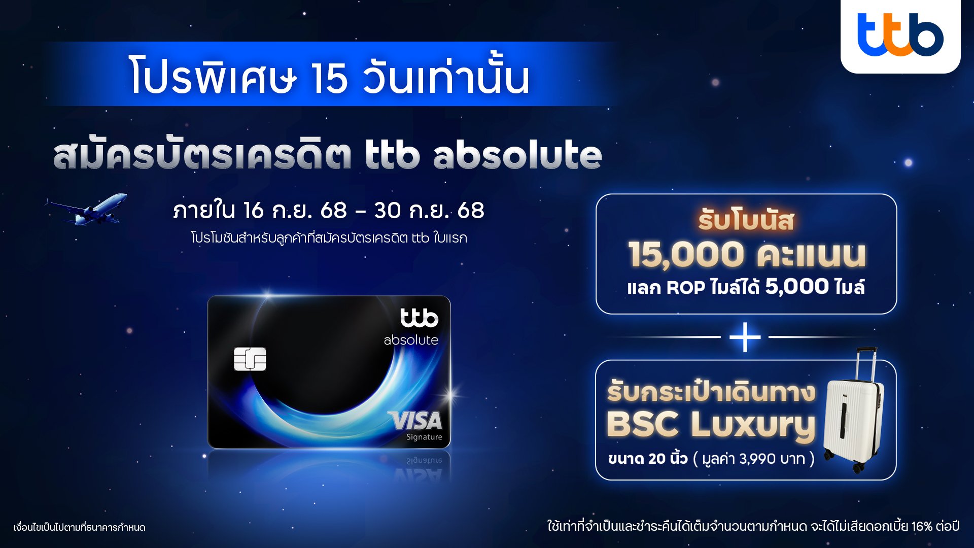 ดีลพิเศษ 15 วันเท่านั้น ทีทีบี จัดโปรสมัครบัตรเครดิต ttb absolute รับฟรีโบนัสเพิ่ม 15,000 คะแนน แลกได้ 5,000 ไมล์ และกระเป๋าเดินทาง 20 นิ้ว