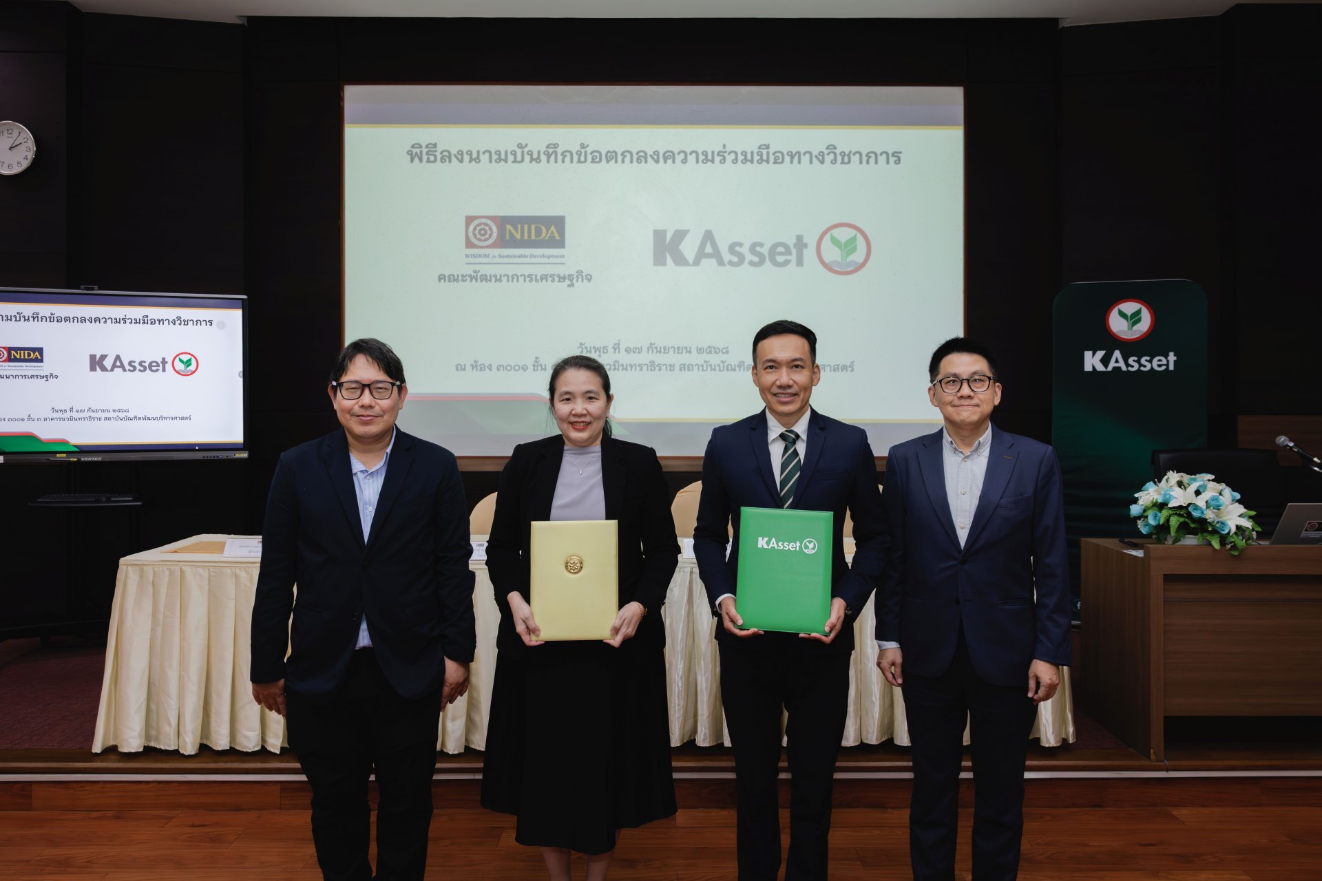บริษัทหลักทรัพย์จัดการกองทุน กสิกรไทย จำกัด (บลจ.กสิกรไทย) และ สถาบันบัณฑิตพัฒนบริหารศาสตร์ โดยคณะพัฒนาการเศรษฐกิจ (นิด้า) ได้ร่วมลงนามในบันทึกข้อตกลงความร่วมมือทางวิชาการ เพื่อส่งเสริมการพัฒนาความรู้ทางวิชาการด้านการเงิน การลงทุน และการบริหารความเสี่ยงอย่างยั่งยืน โดยมีเป้าหมายที่จะสร้างองค์ความรู้ร่วมกันระหว่างภาคการเงินและภาคการศึกษา พัฒนาหลักสูตรหรือกิจกรรมที่ตอบโจทย์การพัฒนาที่ยั่งยืน เสริมสร้างประสบการณ์นักศึกษาภายใต้โครงงานวิศวกรรมการเงิน ส่งเสริมการวิจัยและการแลกเปลี่ยนองค์ความรู้ระหว่างนักวิชาการและผู้เชี่ยวชาญด้านการลงทุน พร้อมสร้างเครือข่ายความสัมพันธ์ระหว่าง บลจ.กสิกรไทย และสถาบันการศึกษา โดยได้รับเกียรติจาก รองศาสตราจารย์ ดร.ปริยดา สุขเจริญสิน (ที่ 2 จากซ้าย) คณบดีคณะพัฒนาการเศรษฐกิจ นิด้า และ นายวิน พรหมแพทย์, CFA (ที่ 2 จากขวา) ประธานกรรมการบริหาร บลจ.กสิกรไทย เป็นผู้แทนร่วมลงนาม ณ อาคารนวมินทราธิราช นิด้า เมื่อเร็ว ๆ นี้