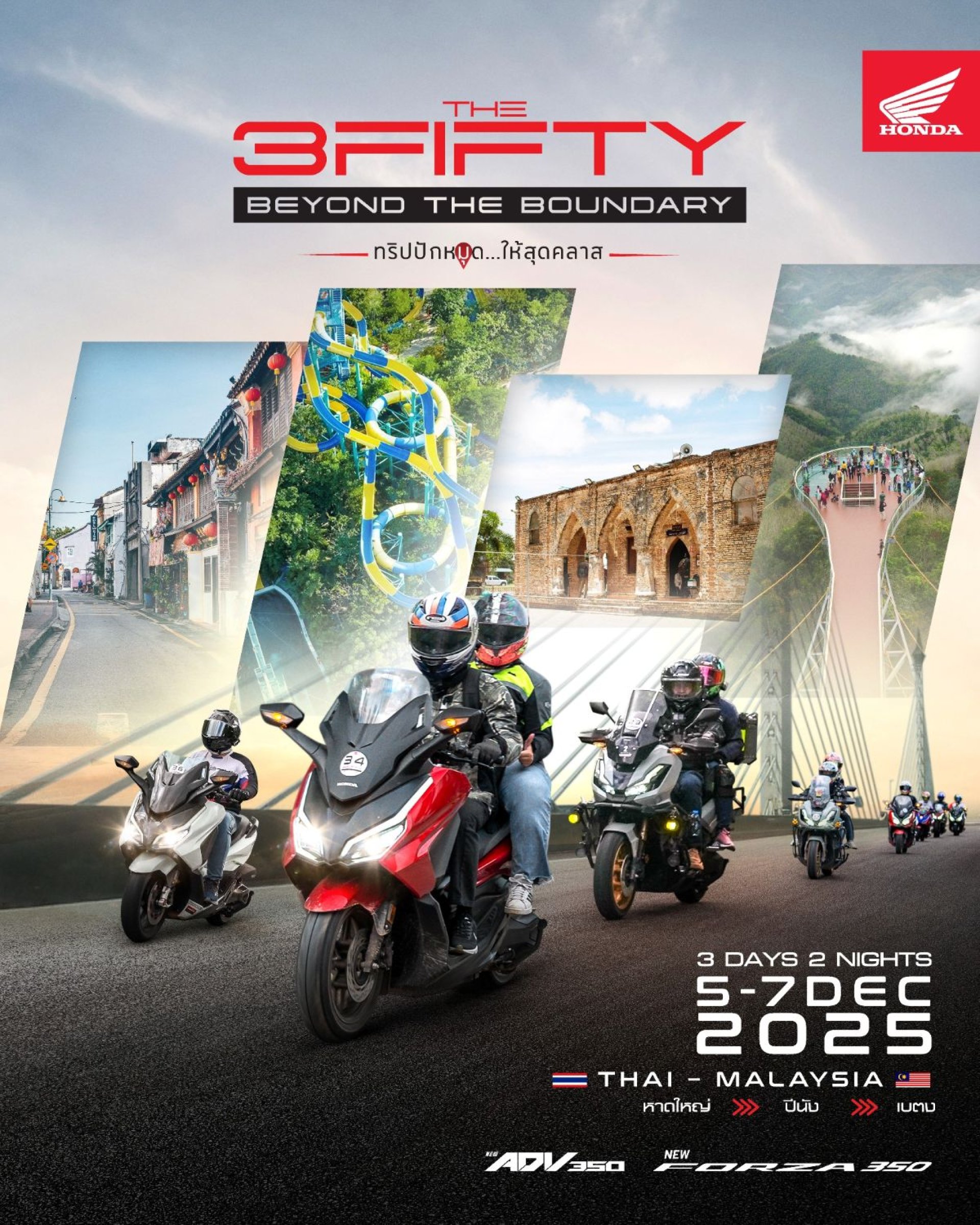 ไทยฮอนด้า เตรียมเปิดประสบการณ์การเดินทางครั้งใหม่ในกิจกรรม The 3Fifty Beyond The Boundary Chapter 2 เชิญชวนชาว FORZA และ ADV รุ่น 350 ซีซี เดินทางข้ามแดนบนเส้นทางพิเศษจากหาดใหญ่ สู่ปีนัง ประเทศมาเลเซีย ก่อนปิดท้ายที่เมืองเบตง จังหวัดยะลา พร้อมเพลิดเพลินกับประสบการณ์การขับขี่ท่ามกลางธรรมชาติ เส้นทางเลียบทะเล และวัฒนธรรมอันหลากหลาย อีกทั้งได้พักผ่อนในเมืองที่เต็มไปด้วยเสน่ห์น่าค้นหา ระหว่างวันที่ 57 ธันวาคม 2568 นี้