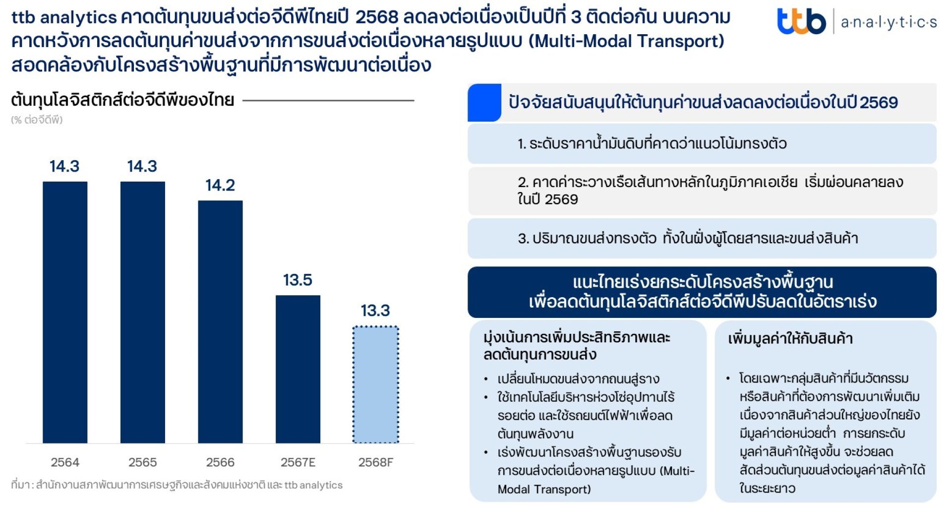 ttb analytics คาดต้นทุนขนส่งต่อจีดีพีไทยปี 2568 ลดลงต่อเนื่องเป็นปีที่ 3 ติดต่อกัน บนความคาดหวังการลดต้นทุนค่าขนส่งจากการขนส่งต่อเนื่องหลายรูปแบบ (Multi-Modal Transport) สอดคล้องกับโครงสร้างพื้นฐานที่มีการพัฒนาต่อเนื่อง