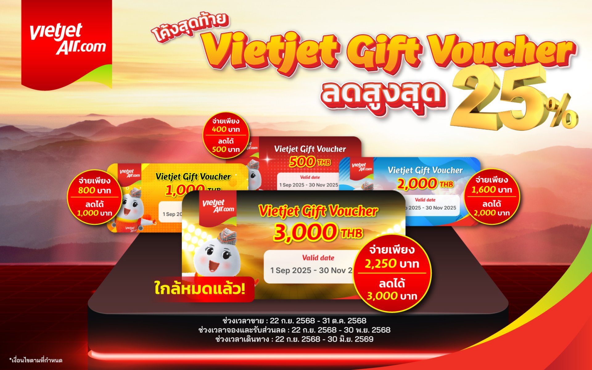 เวียตเจ็ทไทยแลนด์ ส่งโปรโมชันสุดคุ้ม Vietjet Gift Voucher ของขวัญพิเศษ สำหรับคนพิเศษ ให้ผู้โดยสารทุกท่านสามารถเลือกซื้อบัตรกำนัลแทนส่วนลดในราคาสุดคุ้ม ลดสูงสุด 25%พร้อมส่งต่อความสุขและเซอร์ไพรส์แก่คนสำคัญในทุกโอกาสโดยสามารถใช้สำหรับการสำรองเที่ยวบินของเวียตเจ็ทไทยแลนด์ เพื่อสัมผัสประสบการณ์เดินทางที่คุ้มค่า ประหยัดและประทับใจทุกโมเมนต์ ครอบคลุมทั้งเส้นทางบินภายในประเทศและระหว่างประเทศ เปิดจำหน่ายแล้วตั้งแต่วันนี้เป็นต้นไป - 31 ตุลาคม 2568 โดยสามารถใช้สำรองที่นั่งบัตรโดยสารถึงวันที่ 30 พฤศจิกายน 2568 ผู้ที่สนใจสามารถเข้าชมข้อมูลโปรโมชันเพิ่มเติมได้ทางเฟซบุ๊ก ออฟฟิเชียล https://www.facebook.com/VietJetThailand