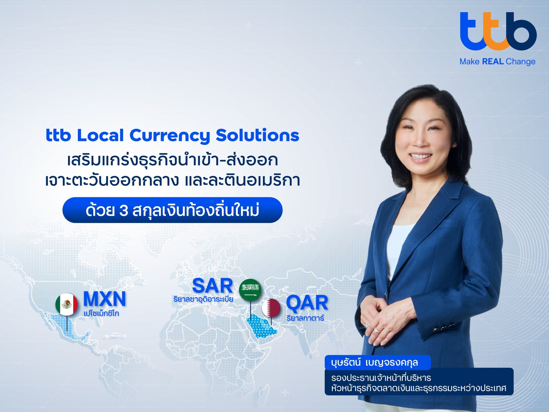 ทีทีบี หนุนธุรกิจไทยใช้สกุลเงินท้องถิ่นบริหารความเสี่ยงค่าเงิน เปิด 3 สกุลเงินใหม่ ตอบโจทย์ตลาดตะวันออกกลาง และละตินอเมริกา