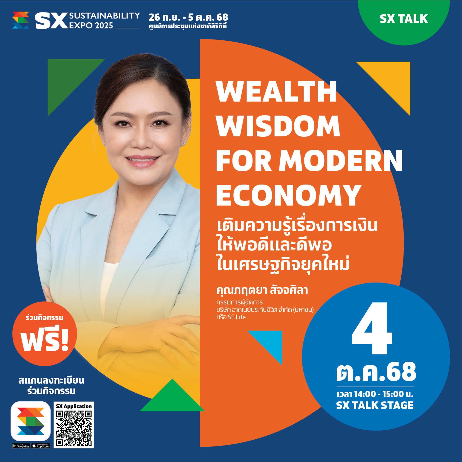 วางแผนการเงินอย่างไร? ให้รอดในเศรษฐกิจยุคใหม่ พบคำตอบได้ในงาน SX SUSTAINABILITY EXPO 2025 โดยบริษัท อาคเนย์ประกันชีวิต จำกัด (มหาชน) หรือ SE Life หนึ่งในสายธุรกิจหลักของไทยกรุ๊ป โฮลดิ้งส์ กลุ่มธุรกิจประกันและการเงินในเครือทีซีซี ขอเชิญชวนนิสิตนักศึกษา กลุ่มคนวัยทำงาน และผู้ที่สนใจสร้างความมั่นคงทางการเงินในระยะยาวเพื่อชีวิตที่ดีในเศรษฐกิจยุคใหม่ ร่วมรับความรู้ฟรี ไม่มีค่าใช้จ่าย!! กับกิจกรรม Talk Stage หัวข้อ WEALTH WISDOM FOR MODERN ECONOMY : เติมความรู้เรื่องการเงินให้พอดีและดีพอ ในเศรษฐกิจยุคใหม่ โดยคุณภฤตยา สัจจศิลา กรรมการผู้จัดการ SE Life อาคเนย์ประกันชีวิต ในวันเสาร์ที่ 4 ตุลาคม 2568 เวลา 14.00 15.00 น. ที่โซน SX TALK STAGE ณ ศูนย์การประชุมแห่งชาติสิริกิติ์ ผู้ที่สนใจสามารถ Scan ลงทะเบียนร่วมกิจกรรม และจองที่นั่งล่วงหน้าได้ทาง QR Code