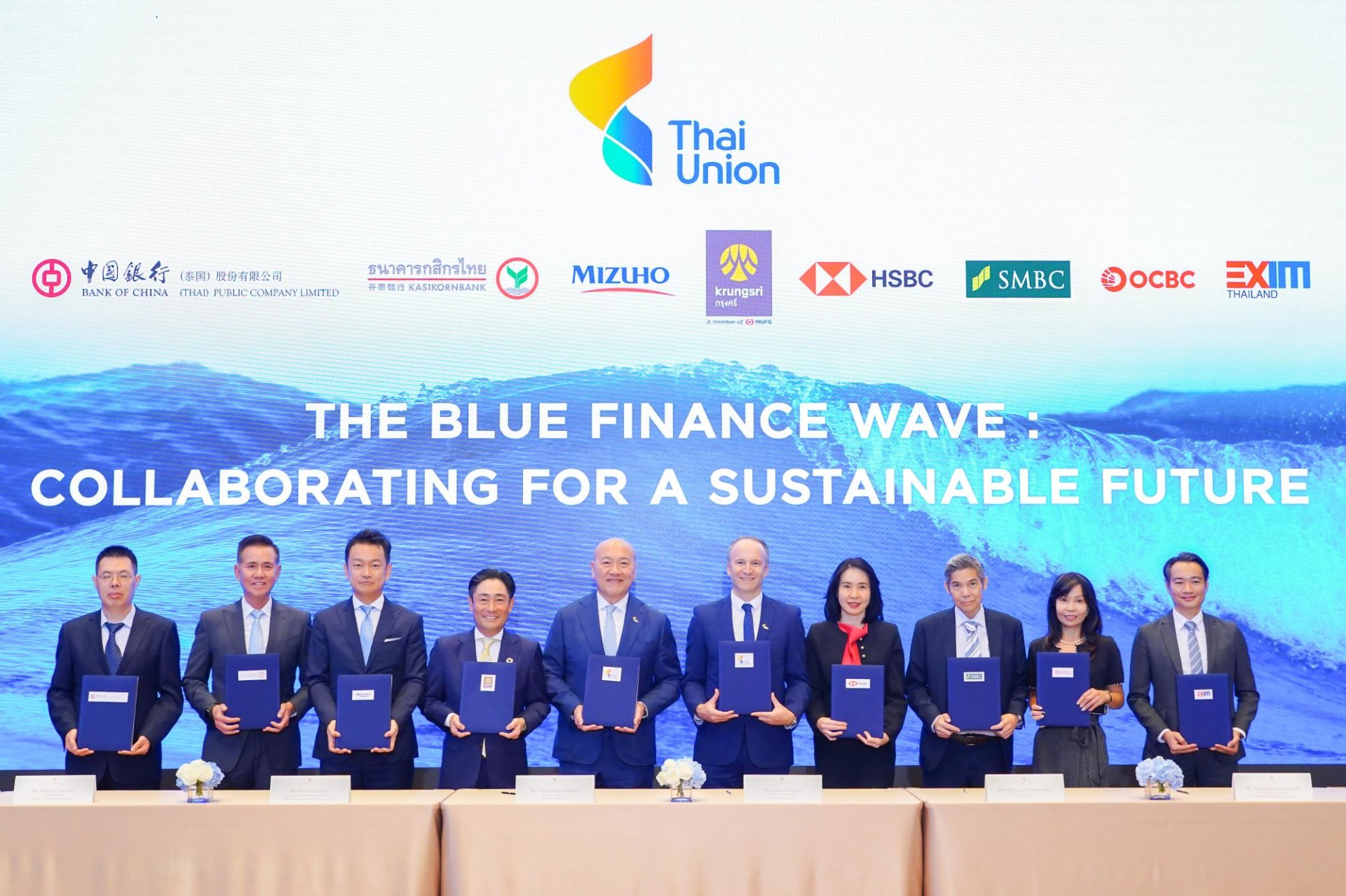 นายอิทธิพล เลิศศักดิ์ธนกุล รองกรรมการผู้จัดการ ธนาคารเพื่อการส่งออกและนำเข้าแห่งประเทศไทย (EXIM BANK) นายธีรพงศ์ จันศิริ ประธานเจ้าหน้าที่บริหาร และนายลูโดวิค การ์นิเยร์ ประธานเจ้าหน้าที่บริหาร ด้านการเงิน บริษัท ไทยยูเนี่ยน จำกัด (มหาชน) (TU) และผู้บริหารสถาบันการเงิน 7 แห่ง ร่วมลงนามในสัญญาเงินกู้เพื่อความยั่งยืน Sustainability-Linked Loan (SLL) จำนวน 10,000 ล้านบาท ณ โรงแรมโอกุระ เพรสทีจ กรุงเทพฯ เมื่อวันที่ 29 กันยายน 2568