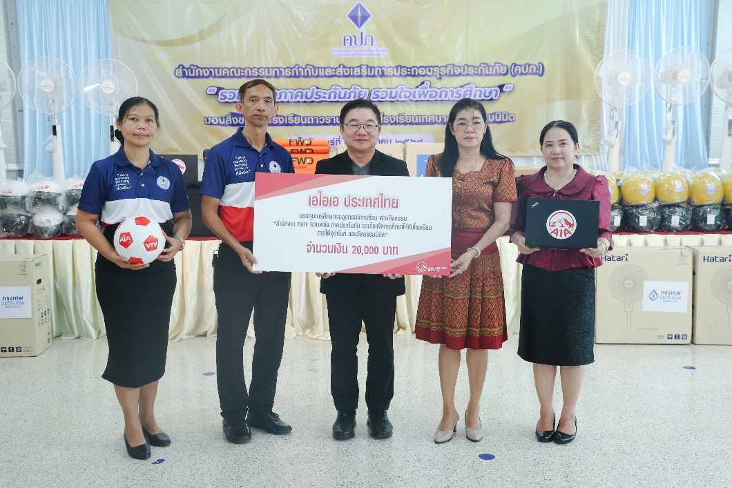 นอกจากนี้ นายสุวิรัช พงศ์เสาวภาคย์ (กลาง) ผู้อำนวยการฝ่ายกิจการภายนอก เป็นผู้แทนเอไอเอ ประเทศไทยมอบทุนการศึกษาจำนวน 20,000 บาท ลูกฟุตบอล 5 ลูก และแล็ปท็อป 10 เครื่อง โดยมีนายโชคอนันต์ นาคสงวน (ที่ 2 จากซ้าย) ผู้อำนวยการโรงเรียนเทศบาลวัดธรรมนิมิต และนางสาวณัฏฐ์วิภา สุริยันต์ (ที่ 2 จากขวา) รองผู้อำนวยการกลุ่มบริหารงานบุคคล โรงเรียนถาวรานุกูล เป็นผู้รับมอบ ผ่านกิจกรรม สำนักงาน คปภ. รวมพลังภาคประกันภัย รวมใจเพื่อการศึกษาให้กับโรงเรียนภายใต้การอุปถัมภ์ของวัดธรรมนิมิต เพื่อส่งเสริมด้านการศึกษาแก่เด็กนักเรียนของโรงเรียนในพระอุปถัมภ์ของวัดธรรมนิมิตทั้ง 2 แห่ง ซึ่งกิจกรรมครั้งนี้สะท้อนถึงความมุ่งมั่นของเอไอเอ ประเทศไทย ในการมีส่วนร่วมกับสังคมและชุมชน ผ่านการสนับสนุนกิจกรรมทางศาสนาและวัฒนธรรม ตลอดจนส่งเสริมด้านการศึกษาของเยาวชนไทย สอดคล้องกับพันธกิจที่มุ่งมั่นในการสนับสนุนให้คนไทยและเยาวชนมีสุขภาพและชีวิตที่ดีขึ้น ตามคำมั่นสัญญา Healthier, Longer, Better Lives