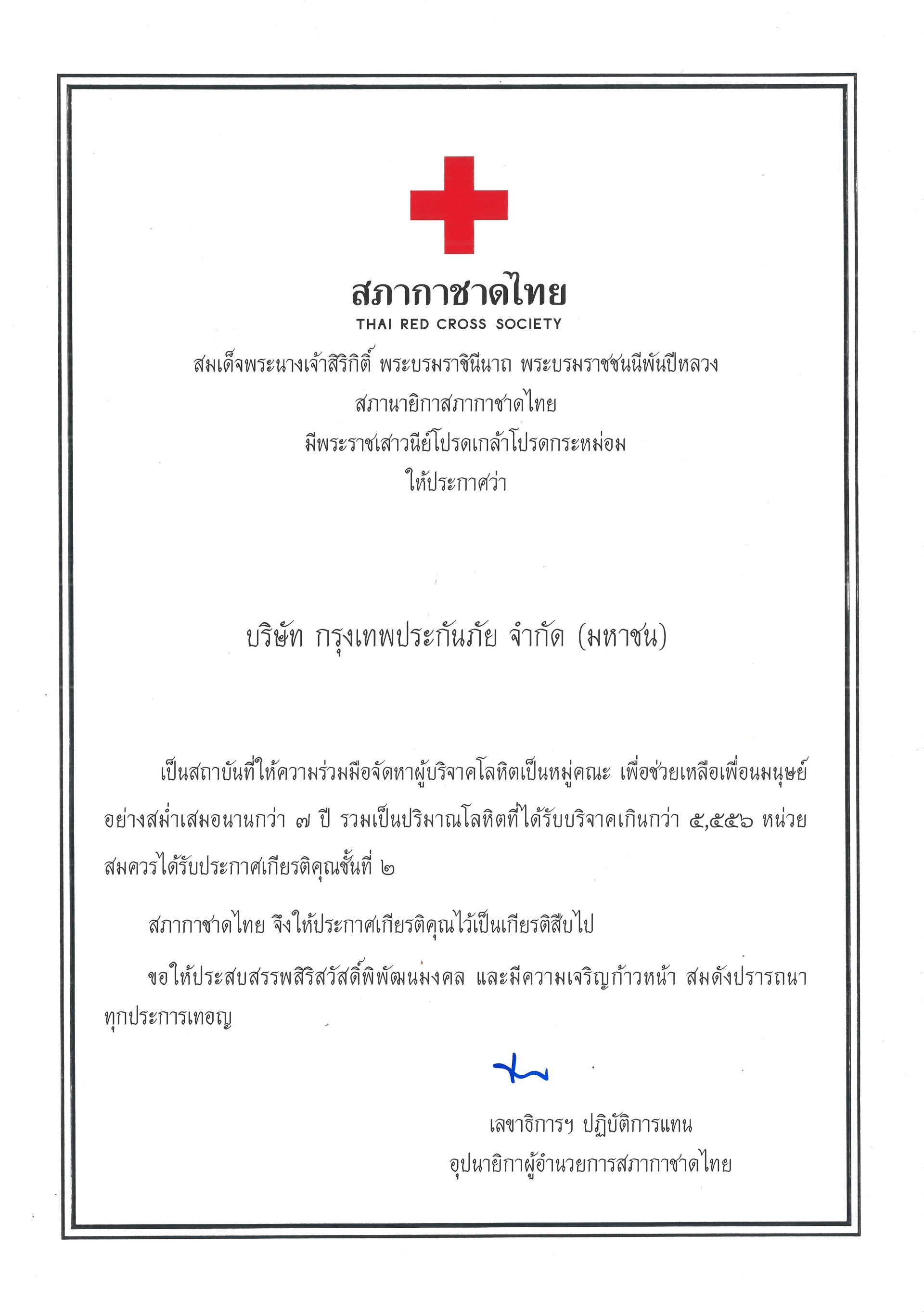 กรุงเทพประกันภัยรับประกาศเกียรติคุณจากสภากาชาดไทย สานต่อเจตนารมณ์แห่งการให้และสนับสนุนการบริจาคโลหิตอย่างต่อเนื่อง บริษัท กรุงเทพประกันภัย จำกัด (มหาชน) ได้รับใบประกาศเกียรติคุณชั้นที่ 2 จากสภากาชาดไทย ในฐานะองค์กรที่ให้การสนับสนุนและความร่วมมือในการจัดหาผู้บริจาคโลหิตเป็นหมู่คณะอย่างต่อเนื่อง โดยบริษัทฯ ได้ดำเนินโครงการบริจาคโลหิตมาตั้งแต่ปี 2531 และจัดกิจกรรมทุก 3 เดือน เพื่อสนับสนุนการสำรองโลหิตให้เพียงพอสำหรับการรักษาผู้ป่วยในโรงพยาบาลต่างๆ ทั่วประเทศ ถือเป็นการต่อชีวิตและยกระดับคุณภาพชีวิตที่ดีของคนในสังคม ควบคู่ไปกับการขับเคลื่อนนโยบายพัฒนาองค์กรอย่างยั่งยืน