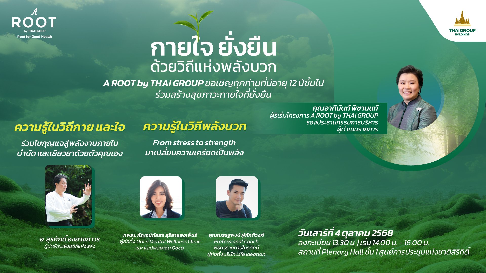 A ROOT By Thai Group ขอเชิญผู้สนใจสร้างสุขภาวะที่ดีอย่างยั่งยืน เข้าร่วมงาน กายใจ ยั่งยืน ด้วยวิถีแห่งพลังบวก เรียนรู้การดูแลสุขภาพ พร้อมเปลี่ยนความเครียดให้เป็นพลัง เสริมสร้างกายใจให้แข็งแรงและยั่งยืนไปด้วยกัน โดยนางอาทินันท์ พีชานนท์ รองประธานกรรมการบริหาร บริษัท ไทยกรุ๊ป โฮลดิ้งส์ จำกัด (มหาชน) ให้เกียรติร่วมพูดคุยกับวิทยากรผู้เชี่ยวชาญเพื่อสร้างแรงบันดาลใจและเปิดมุมมองใหม่ในการดูแลสุขภาพ เริ่มด้วย ความรู้ในวิถีกาย และใจ ที่จะมาร่วมไขกุญแจสู่พลังงานภายใน บำบัด และเยียวยาด้วยตัวคุณเอง โดยอาจารย์สุรศักดิ์ องอาจถาวร ต่อด้วยหัวข้อ ความรู้ในวิถีพลังบวก From stress to strength เปลี่ยนความเครียดให้เป็นพลัง โดย ทพญ.กัญจน์ภัสสร สุริยาแสงเพ็ชร์ ผู้ก่อตั้ง Ooca Mental Wellness Clinic และคุณณรรฐพงษ์ ผู้ภักดีวงศ์ Professional Coach พิธีกรรายการโทรทัศน์ ผู้ก่อตั้งบริษัท Life Ideation ในวันเสาร์ที่ 4 ตุลาคม 2568 เวลา 14.00 16.00 น. ณ Plenary Hall ชั้น 1 ศูนย์การประชุมแห่งชาติสิริกิติ์ ผู้ที่สนใจสามารถ Scan ลงทะเบียนร่วมกิจกรรมได้ฟรี โดยไม่มีค่าใช้จ่าย