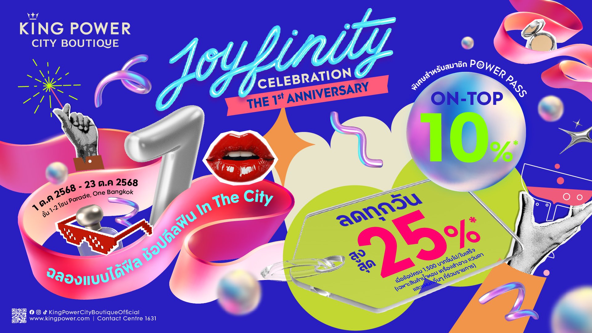 คิง เพาเวอร์ ซิตี บูทีก ที่สุดแห่งประสบการณ์ช้อปมิติใหม่ใจกลางเมือง จัดแคมเปญ JOYFINITY CELEBRATION THE 1st ANNIVERSARY: ฉลองแบบได้ฟีล ช้อปดีลฟิน IN THE CITY เฉลิมฉลองโอกาสครบรอบ 1 ปี ชวนสายช้อปและสายชิลมาสัมผัสโปรโมชันสุดฮอต มีไฟลต์หรือไม่มีไฟลต์บินก็ช้อปได้ รับส่วนลดแบบจัดเต็ม พร้อมกิจกรรมเซอร์ไพรส์ ตลอดเดือนตุลาคมนี้
