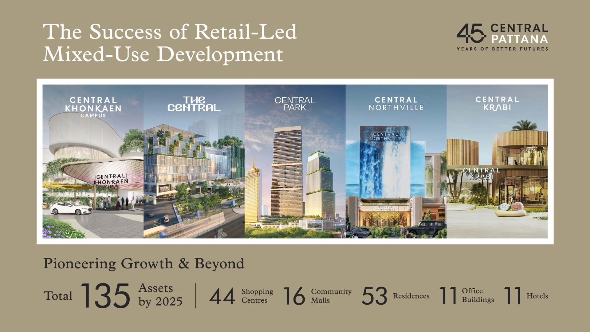 ตลอด 45 ปีที่ผ่านมา เซ็นทรัลพัฒนาเติบโตเคียงข้างลูกค้า คู่ค้า พนักงาน และชุมชน ด้วยกลยุทธ์ Retail-Led Mixed-Use Development ที่ไม่เพียงสร้างแลนด์มาร์ก แต่ยังสร้างชีวิต สร้างโอกาส และสร้างอนาคตที่ดีให้กับทุกคน ทั้งนี้เซ็นทรัลพัฒนาเดินหน้าแผนการลงทุนกว่า 120,000 ล้านบาทใน 5 ปี (2568-2572) เพื่อเปิดตัวเมกะโปรเจ็กต์และโครงการใหม่ทั่วประเทศ โดยโครงการ Central Park ได้เปิดตัวและสร้างปรากฏการณ์ Par Life & Urban Life Integration อย่างยิ่งใหญ่ไปแล้ว และในเดือน ต.ค. 68 นี้ เตรียมเปิดโครงการ Central Krabi มิกซ์ยูสยิ่งใหญ่แห่งแรกของกระบี่พร้อมส่งเสริมด้าน Sustainable Tourism สอดคล้องกับนโยบายของเมือง และตามด้วยเมกะโปรเจ็กต์ในแผนงาน นำโดย The Central พหลโยธิน ที่จะพลิกโฉมย่านให้กลายเป็น New CBD แห่งใหม่ของกรุงเทพฯ