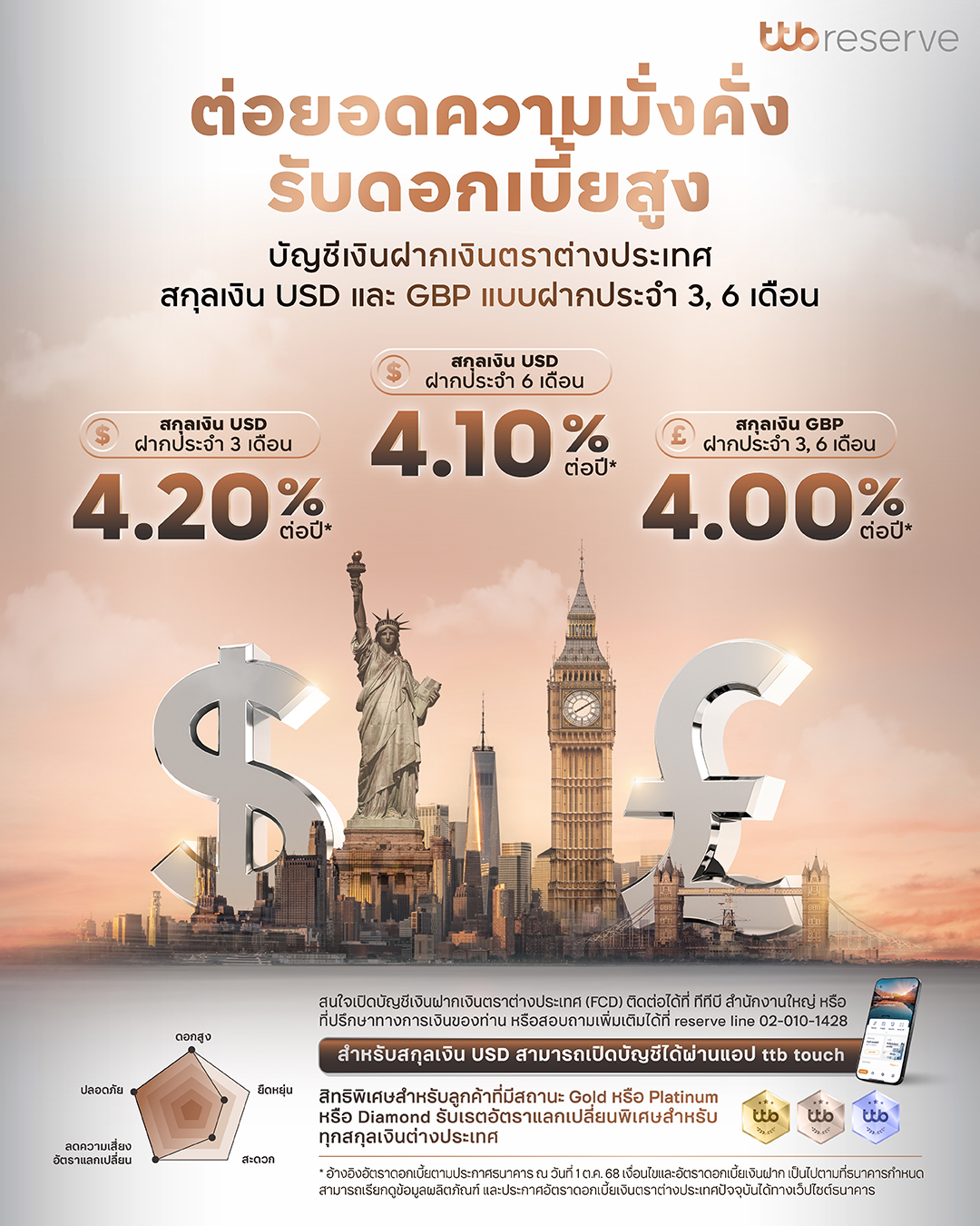ทีทีบี ชวนเปิดบัญชีออมเงินสกุลต่างประเทศ USD และ GBP รับดอกเบี้ยสูงสุด 4.00% ต่อปี ผ่านบัญชี FCD e-Saving