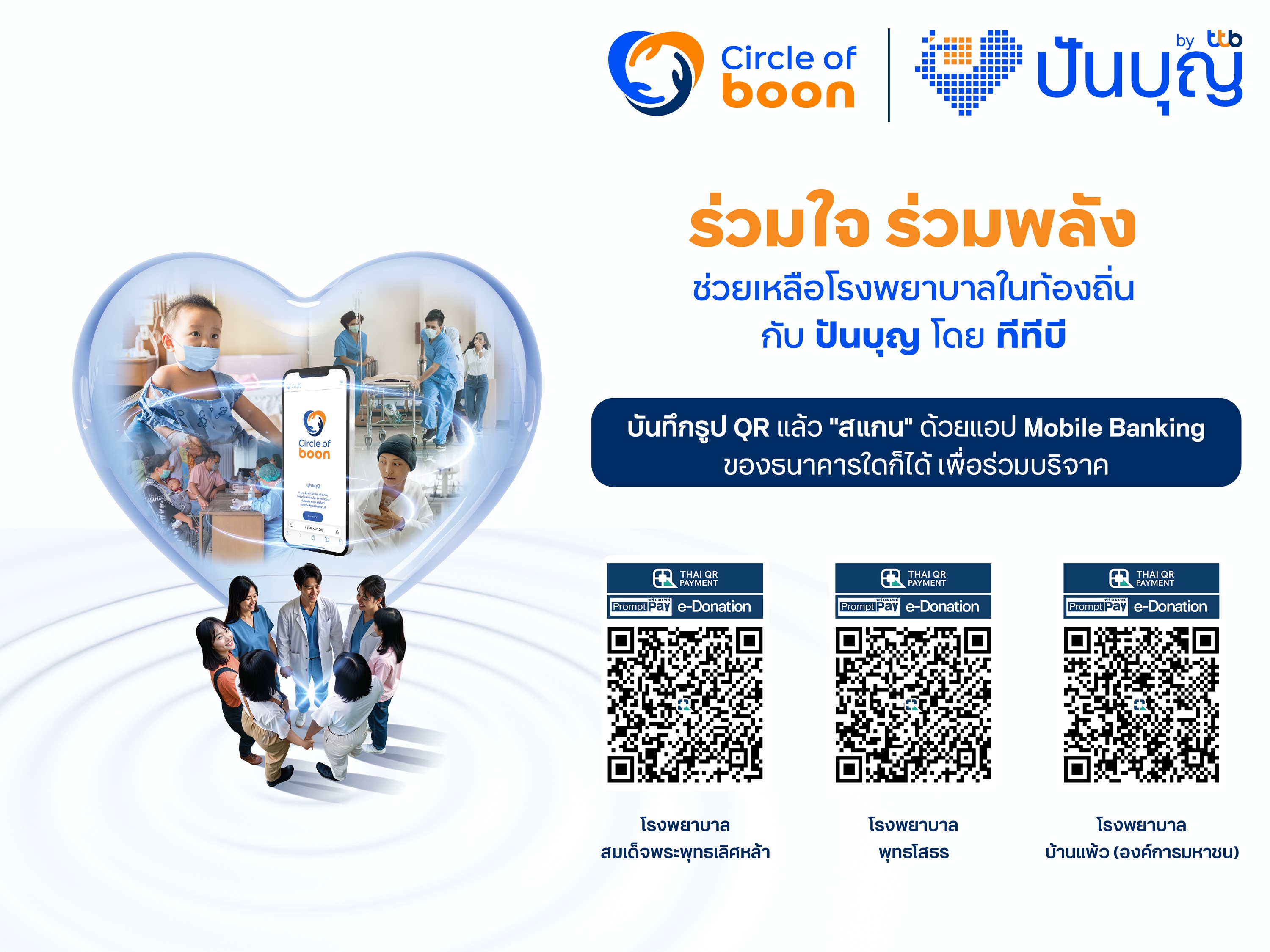 เพราะพลังแห่งการให้ เป็นวัฏจักรที่ไม่มีวันสิ้นสุด ทีทีบียกระดับบทบาทของธนาคารในฐานะผู้ขับเคลื่อนความยั่งยืนของสังคม กับการระดมเงินบริจาคเพื่อโรงพยาบาลท้องถิ่น ผ่านโครงการ Circle of boon วัฏจักรพลังการแบ่งปัน ที่ดำเนินการภายใต้ ปันบุญ โดย ทีทีบี ซึ่งผู้มีจิตศรัทธาสามารถร่วมบริจาคได้ทุกที่ทุกเวลา ผ่านเว็บไซต์ Punboon.org ที่ปลอดภัย เชื่อถือได้ และมีความโปร่งใสทุกขั้นตอน ให้ผู้บริจาคมั่นใจได้ว่า เงินทุกบาทส่งตรงถึงโรงพยาบาลอย่างแท้จริง และโรงพยาบาลท้องถิ่นได้ลงทะเบียน e-Donation กับกรมสรรพากร จึงเป็นทางเลือกให้ผู้บริจาคในการลดหย่อนภาษี 2 เท่าของเงินบริจาคอีกด้วย ขอเชิญชวนทุกคนมาร่วมเป็นส่วนหนึ่งของ Circle of boon วัฏจักรพลังแห่งการแบ่งปัน ทุกบาทของคุณสามารถเปลี่ยนชีวิตผู้ป่วยได้จริง และยั่งยืน