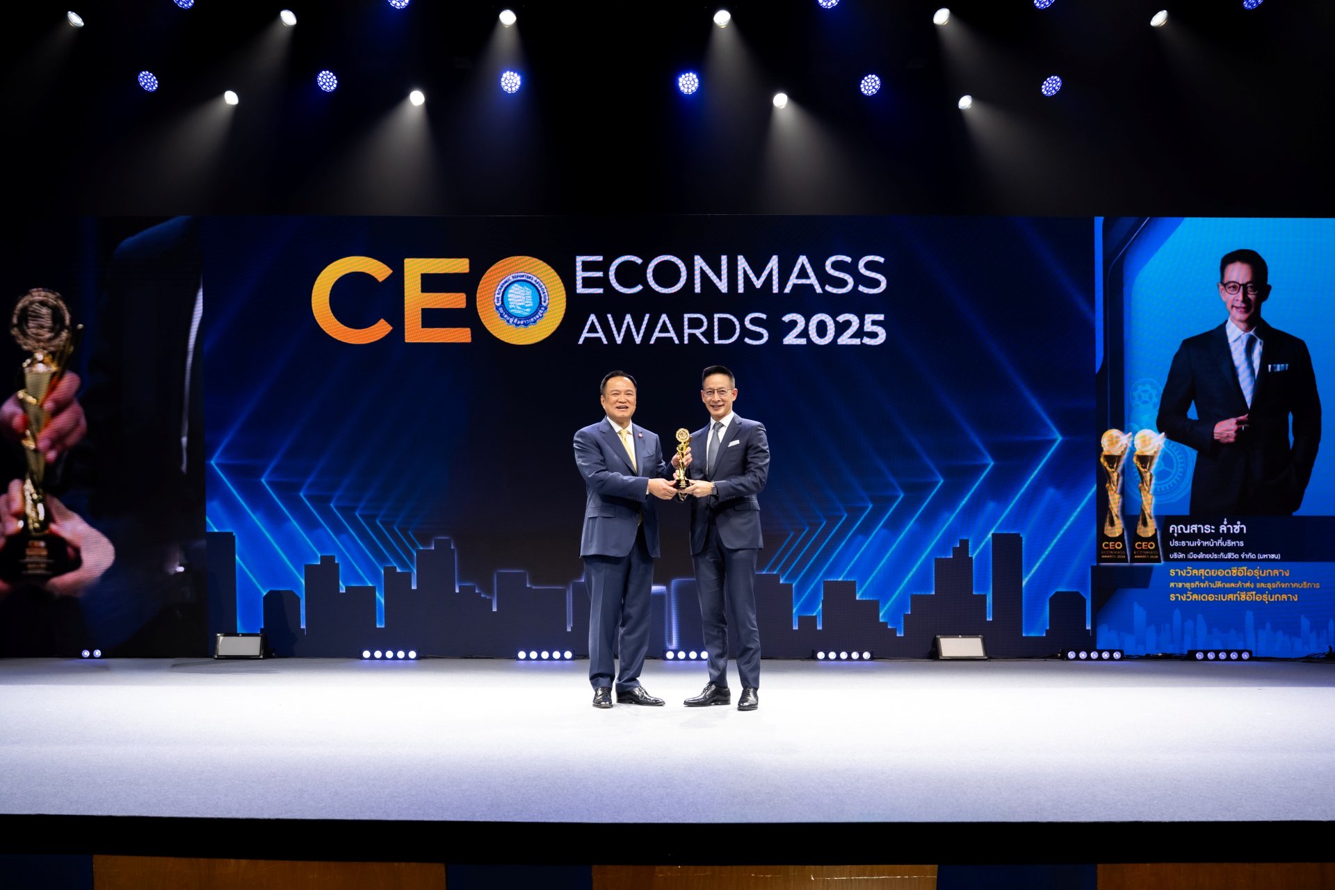 นายสาระ ล่ำซำ ประธานเจ้าหน้าที่บริหาร บริษัท เมืองไทยประกันชีวิต จำกัด (มหาชน) เข้ารับ 2 รางวัลเกียรติยศสุดยอดผู้นำองค์กร ประจำปี 2568 ได้แก่ รางวัล สุดยอดซีอีโอรุ่นกลาง สาขาธุรกิจค้าปลีกและค้าส่ง และธุรกิจภาคบริการ และรางวัล เดอะเบสท์ซีอีโอรุ่นกลาง จากนายอนุทิน ชาญวีรกุล นายกรัฐมนตรีและรัฐมนตรีว่าการกระทรวงมหาดไทย ในงานมอบรางวัล CEO ECONMASS Awards 2025 ซึ่งจัดโดยสมาคมผู้สื่อข่าวเศรษฐกิจ ร่วมกับคณะกรรมการร่วมภาคเอกชน 3 สถาบัน (กกร.) สำนักงานคณะกรรมการนโยบายรัฐวิสาหกิจ (สคร.) และมหาวิทยาลัยหอการค้าไทย งานจัดขึ้น ณ โรงละครอักษรา คิง เพาเวอร์ กรุงเทพฯ