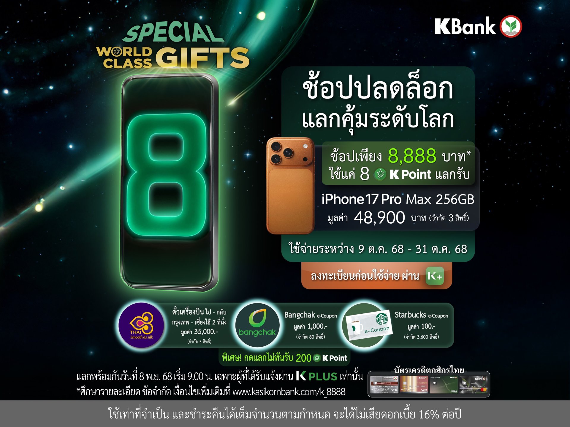 บัตรเครดิตกสิกรไทย จัดเต็มให้ลูกค้ารับความคุ้มครั้งใหม่กับแคมเปญ Special WORLD CLASS GIFTS: ช้อปปลดล็อก แลกคุ้มระดับโลก* จัดโปรโมชั่นพิเศษ เพียงลงทะเบียนก่อนใช้จ่ายผ่าน K PLUS และใช้จ่ายสะสมผ่านบัตรเครดิตกสิกรไทย ครบ 8,888 บาท* ในหมวดสินค้าที่ร่วมรายการ ระหว่างวันที่ 9 ตุลาคม 2568 31 ตุลาคม 2568 รับสิทธิ์ใช้ K Point แค่ 8 คะแนน แลกรับสินค้าแบรนด์ดัง