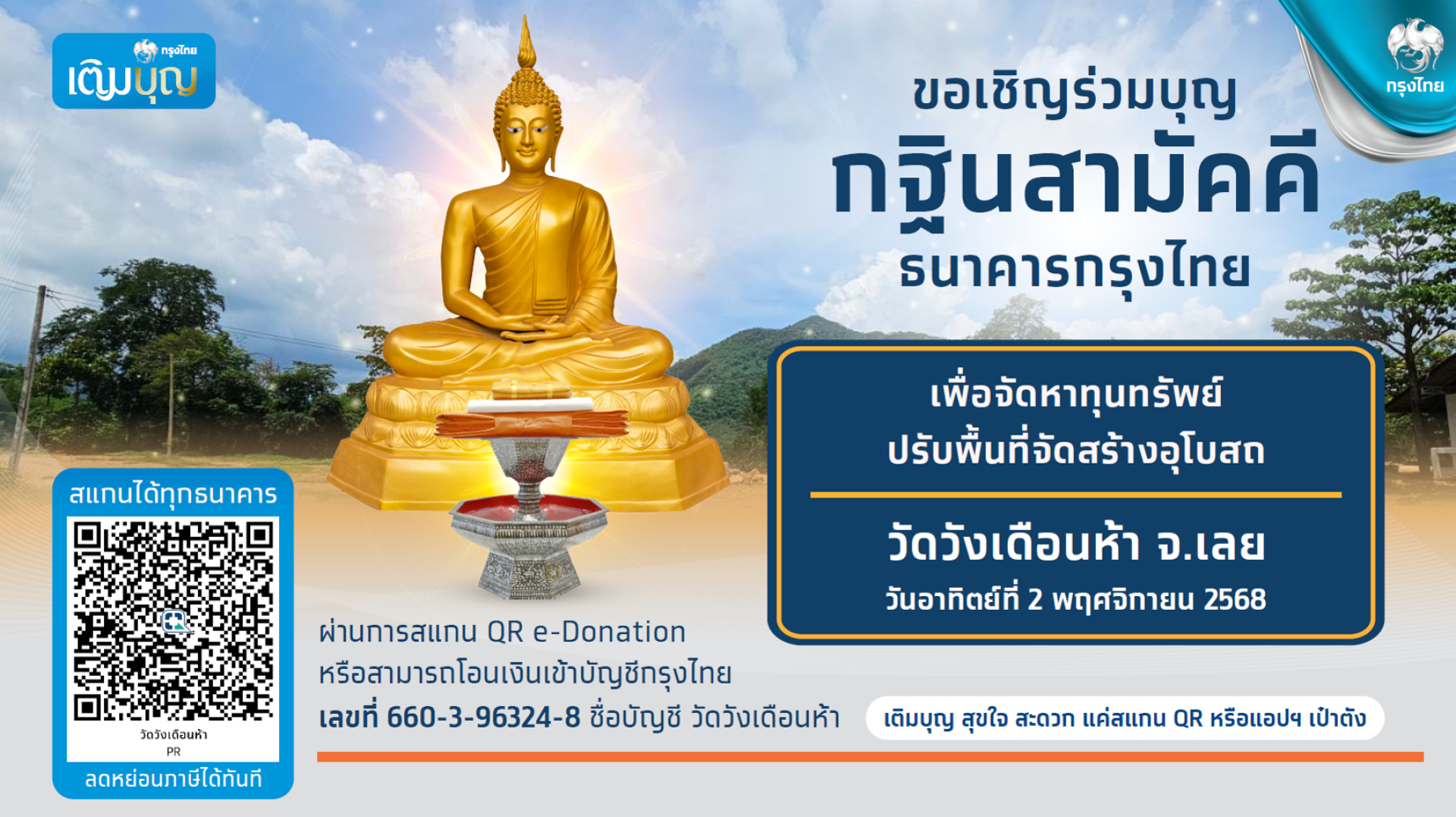 กรุงไทย เชิญชวนร่วมบุญมหากุศล กฐินสามัคคีธนาคารกรุงไทย เพื่อปรับที่ดินสร้างอุโบสถ วัดวังเดือนห้า จังหวัดเลย