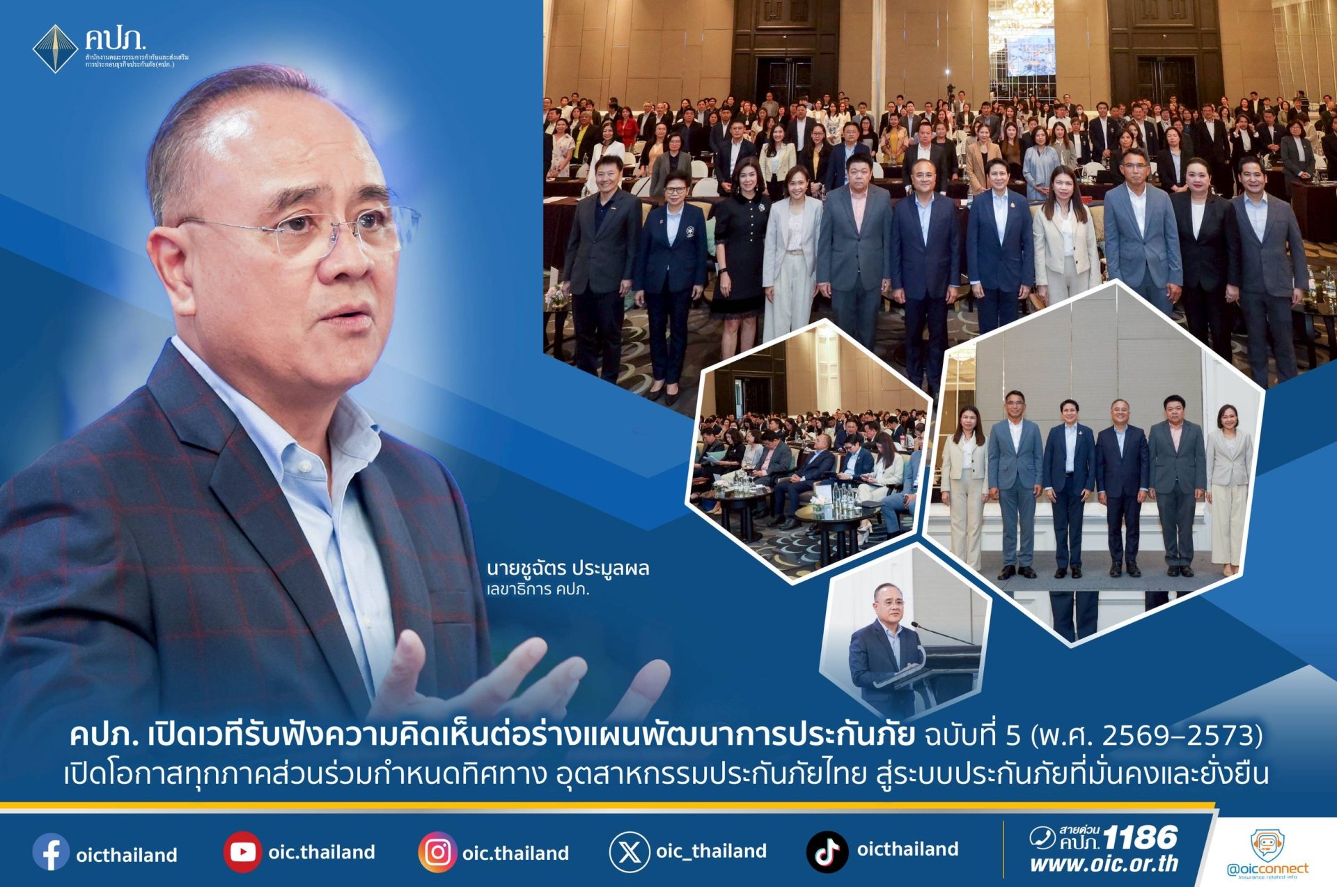 สำนักงานคณะกรรมการกำกับและส่งเสริมการประกอบธุรกิจประกันภัย (สำนักงาน คปภ.) จัดการประชุมรับฟังความคิดเห็น (Public Hearing) ต่อร่างแผนพัฒนาการประกันภัย ฉบับที่ 5 (พ.ศ. 25692573) เพื่อเปิดโอกาสให้ทุกภาคส่วนในอุตสาหกรรมประกันภัยได้มีส่วนร่วมในการกำหนดทิศทางอนาคตของอุตสาหกรรมประกันภัยไทยไปด้วยกัน โดยมีนายชูฉัตร ประมูลผล เลขาธิการ คปภ. เป็นประธานเปิดการประชุม เมื่อวันที่ 22 กันยายน 2568 ณ ห้องวิภาวดี บอลรูม โรงแรมเซ็นทารา แกรนด์ เซ็นทรัลพลาซา ลาดพร้าว กรุงเทพฯ