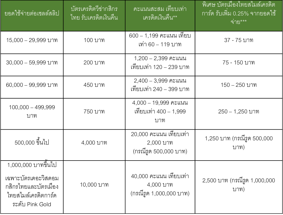 หมายเหตุ: จำกัดการรับเครดิตเงินคืนสูงสุด 10,000 บาท/ท่าน ตลอดรายการ เฉพาะบัตร THE WISDOM กสิกรไทย และบัตรเมืองไทยสไมล์เครดิตการ์ดระดับ Pink Gold จึงจะสามารถรับเงินคืน 10,000 บาทได้