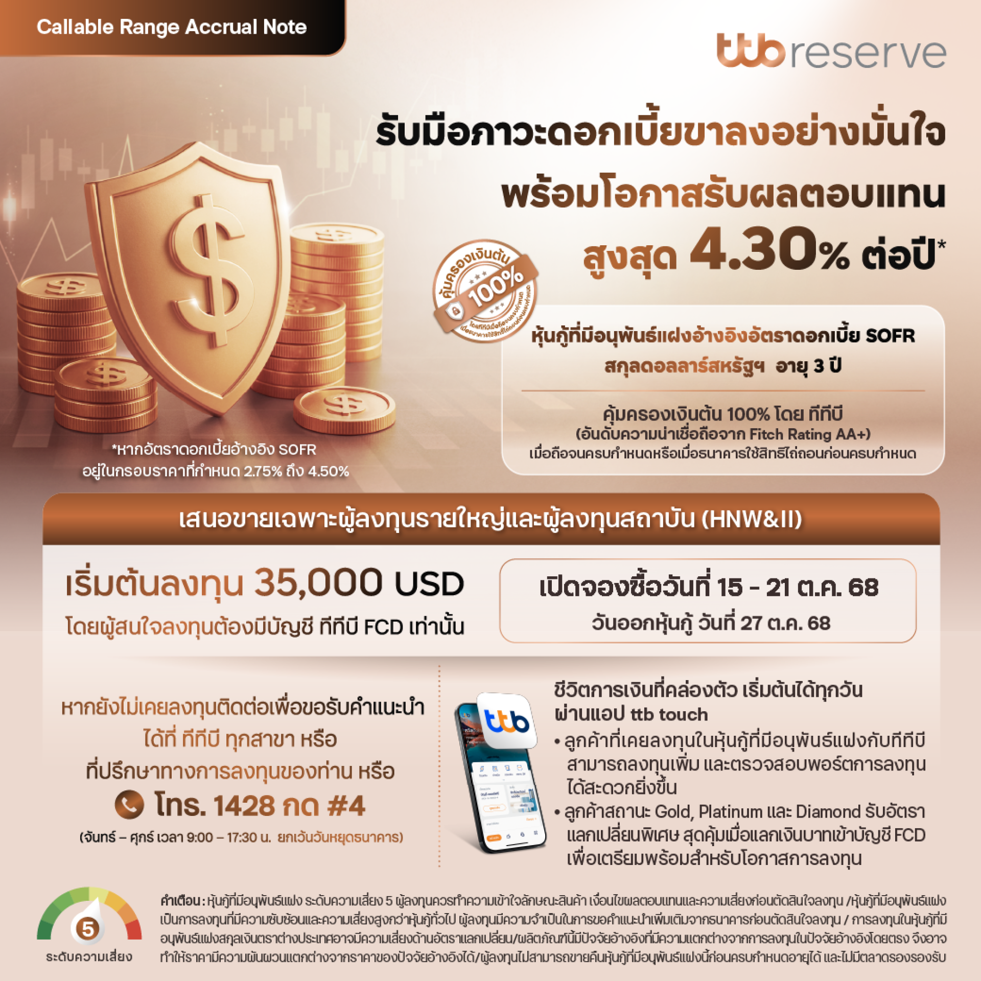 เสนอขายเฉพาะผู้ลงทุนรายใหญ่และผู้ลงทุนสถาบันเท่านั้น โดยสามารถลงทุนเริ่มต้นที่ 35,000 USD และเปิดจองซื้อตั้งแต่วันที่ 15 21 ตุลาคม 2568 เท่านั้น ศึกษารายละเอียดเพิ่มเติมได้ที่ https://www.ttbbank.com/link/pr/ttbreserve/stnrate