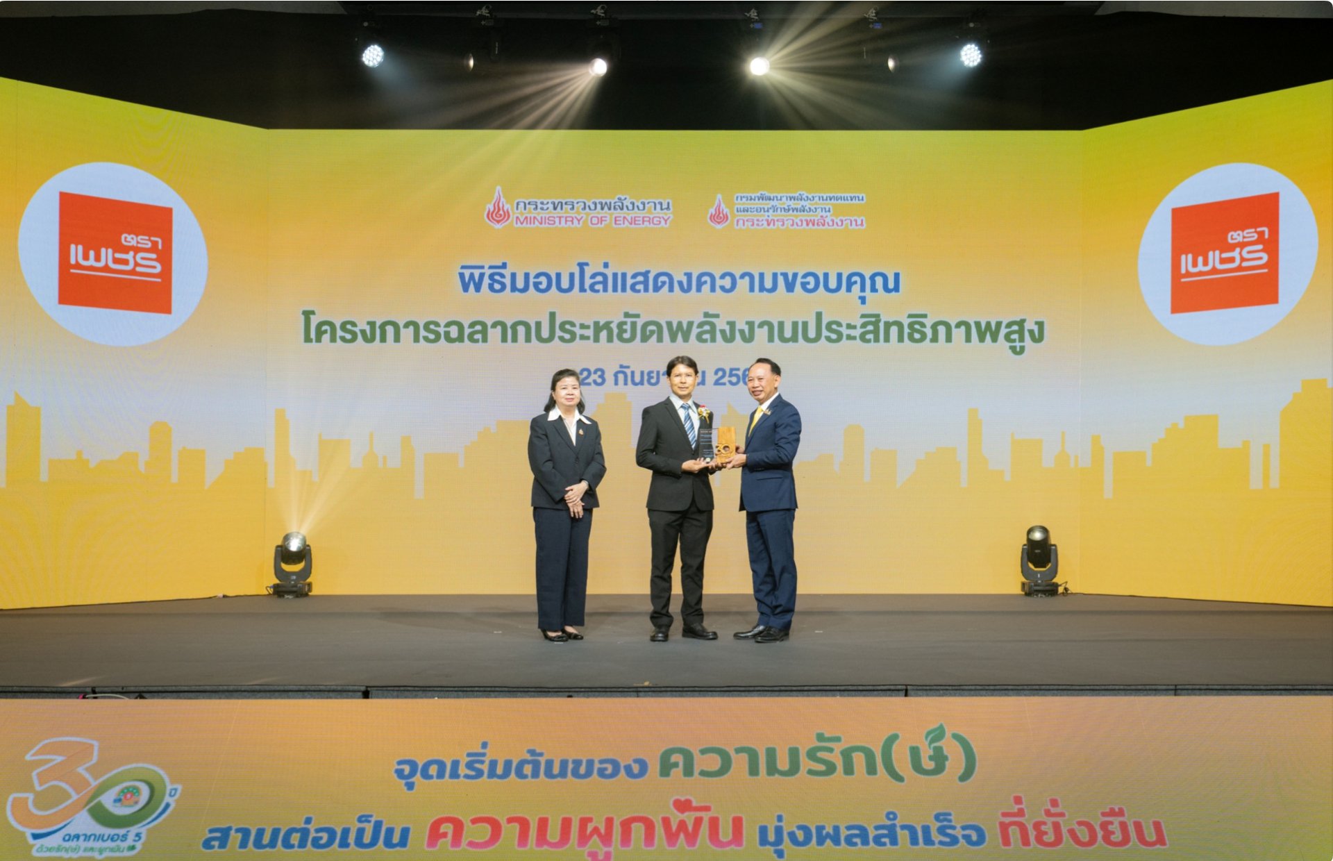 นายสุพจน์ สุวรรณมุณี (กลาง) ผู้จัดการฝ่าย (อาวุโส) สายการผลิตและวิศวกรรม บริษัท ผลิตภัณฑ์ตราเพชร จำกัด (มหาชน) หรือ DRT รับมอบโล่แสดงความขอบคุณโครงการฉลากประหยัดพลังงานประสิทธิภาพสูงจาก ดร.ประเสริฐ สินสุขประเสริฐ (ขวา) ปลัดกระทรวงพลังงาน ภายในงานครบรอบ 30 ปี โครงการฉลากประหยัดไฟฟ้าเบอร์ 5 ทั้งนี้ DRT มีผลิตภัณฑ์ที่ได้รับฉลากประหยัดพลังงานประสิทธิภาพสูงจำนวน 5 รายการ และมีแผนยื่นขอฉลากแสดงระดับประสิทธิภาพพลังงานเบอร์ 5 ภายใต้โครงการใหม่ในปี พ.ศ. 2569 ซึ่งเป็นความร่วมมือระหว่างสองหน่วยงาน ได้แก่ กรมพัฒนาพลังงานทดแทนและอนุรักษ์พลังงาน (พพ.) และ การไฟฟ้าฝ่ายผลิตแห่งประเทศไทย (กฟผ.) ที่ได้รวมการดำเนินงานของทั้งสองโครงการไว้ภายใต้โครงการเดียว งานดังกล่าวจัดขึ้น ณ โรงแรมเซ็นทาราแกรนด์ เซ็นทรัลลาดพร้าว กรุงเทพฯ เมื่อเร็ว ๆ นี้