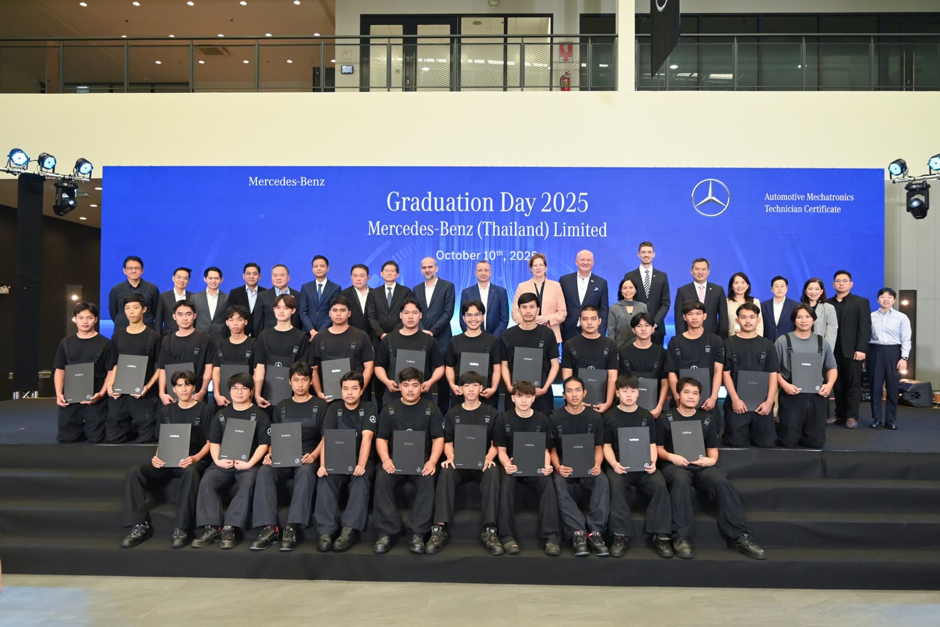 เมื่อวันที่ 10 ตุลาคม 2568 ที่ผ่านมา บริษัท เมอร์เซเดส-เบนซ์ (ประเทศไทย) จำกัด จัดงานวันสำเร็จการศึกษาและมอบประกาศนียบัตรให้แก่นักศึกษาช่างฝึกหัดจำนวน 25 คน ที่สำเร็จการศึกษาโครงการฝึกงานนักเรียนช่างฝึกหัดแบบทวิภาคี ในสาขาวิชาช่างเทคนิคยานยนต์เมคคาทรอนิกส์