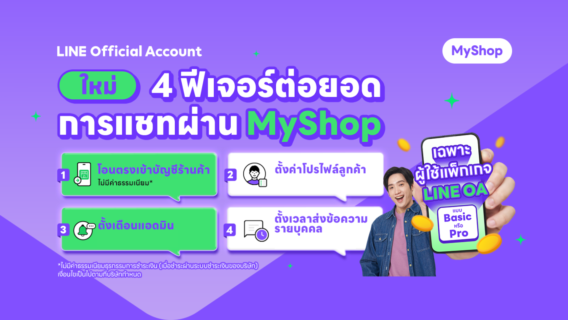 LINE for Business มุ่งยกระดับประสบการณ์ Chat Commerce ให้ร้านค้าแบบครบวงจรด้วยเครื่องมือที่หลากหลาย ช่วยให้ขายของได้ง่ายขึ้น ปิดยอดขายไว พร้อมช่วยจัดการร้านค้าบน LINE ได้อย่างมืออาชีพ ผู้ประกอบการ ร้านค้าที่สนใจ สามารถเริ่มใช้งานทั้ง 4 ฟีเจอร์ใหม่บน MyShop ได้แล้ววันนี้! เพียงอัปเกรดแพ็คเกจบรอดแคสต์ LINE OA เป็นแบบ Basic หรือ Pro ก็พร้อมใช้งานฟีเจอร์ใหม่ทั้งหมดบน MyShop ได้ทันที! มาร่วมยกระดับการขายบน LINE OA ของคุณให้แม่นยำ ตรงใจ ปิดการขายได้ไว รับเงินได้สะดวกกว่าที่เคยด้วย 4 ฟีเจอร์ใหม่บน MyShop กัน