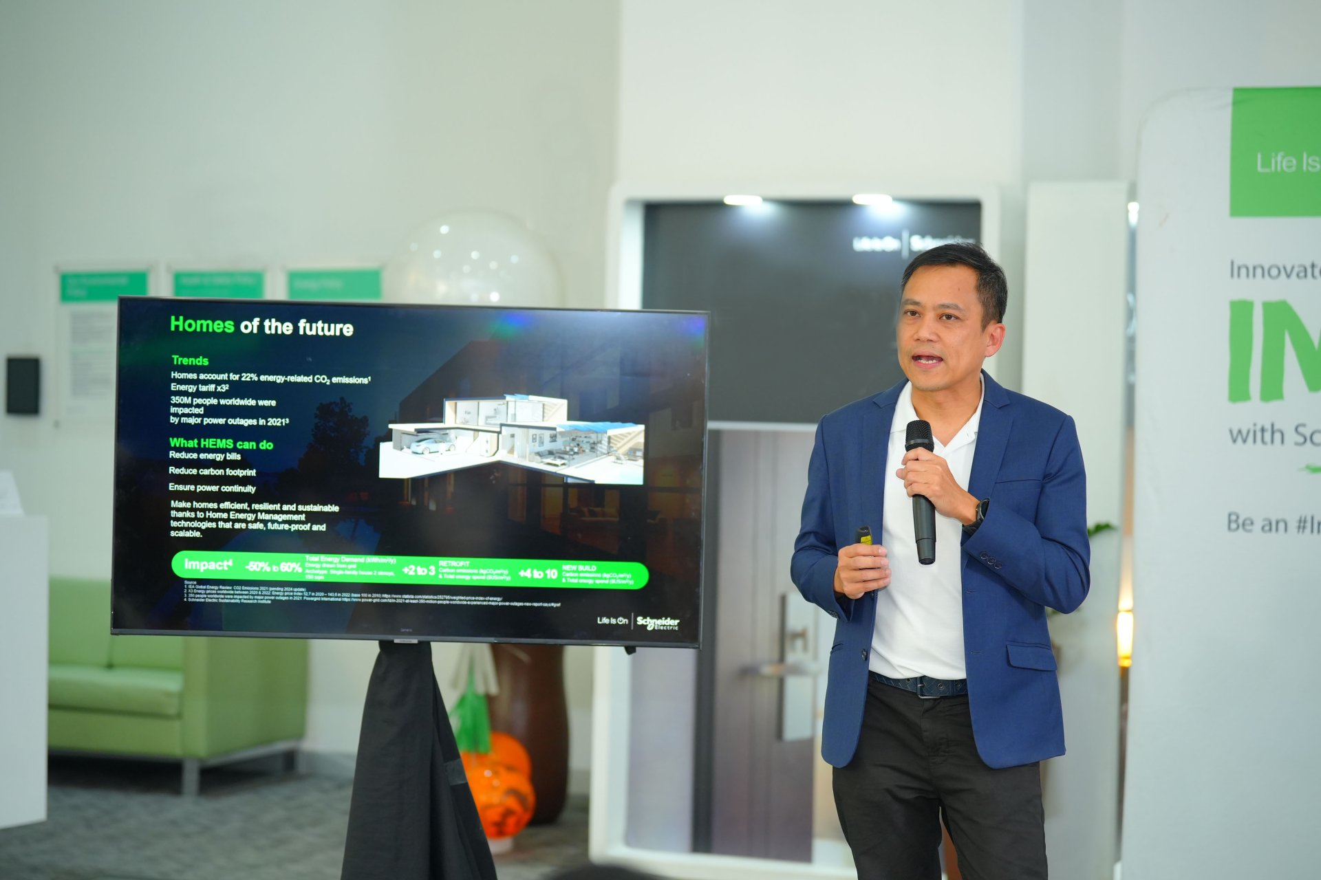 ชไนเดอร์ อิเล็คทริค มุ่งมั่นขับเคลื่อนให้ทุกอุตสาหกรรมเปลี่ยนผ่านสู่ความยั่งยืนด้วยการลดปล่อยก๊าซคาร์บอนไดออกไซด์จากการใช้พลังงาน ผ่านแนวคิดการใช้ไฟฟ้าคู่กับเทคโนโลยีดิจิทัล หรือ Electricity 4.0 โดยการใช้โซลูชั่นบริหารจัดการพลังงานที่มีตัวชี้วัดแม่นยำและให้ผลลัพธ์อย่างเป็นรูปธรรม สำหรับกลุ่มธุรกิจที่พักอาศัย ชไนเดอร์ อิเล็คทริค ได้นำเสนอระบบจัดการพลังงานในบ้านแบบครบวงจร HEMS (Home Energy Management System) ที่ขับเคลื่อนด้วย AI สามารถช่วยลดการใช้พลังงานโดยรวมลงถึง 50-60%