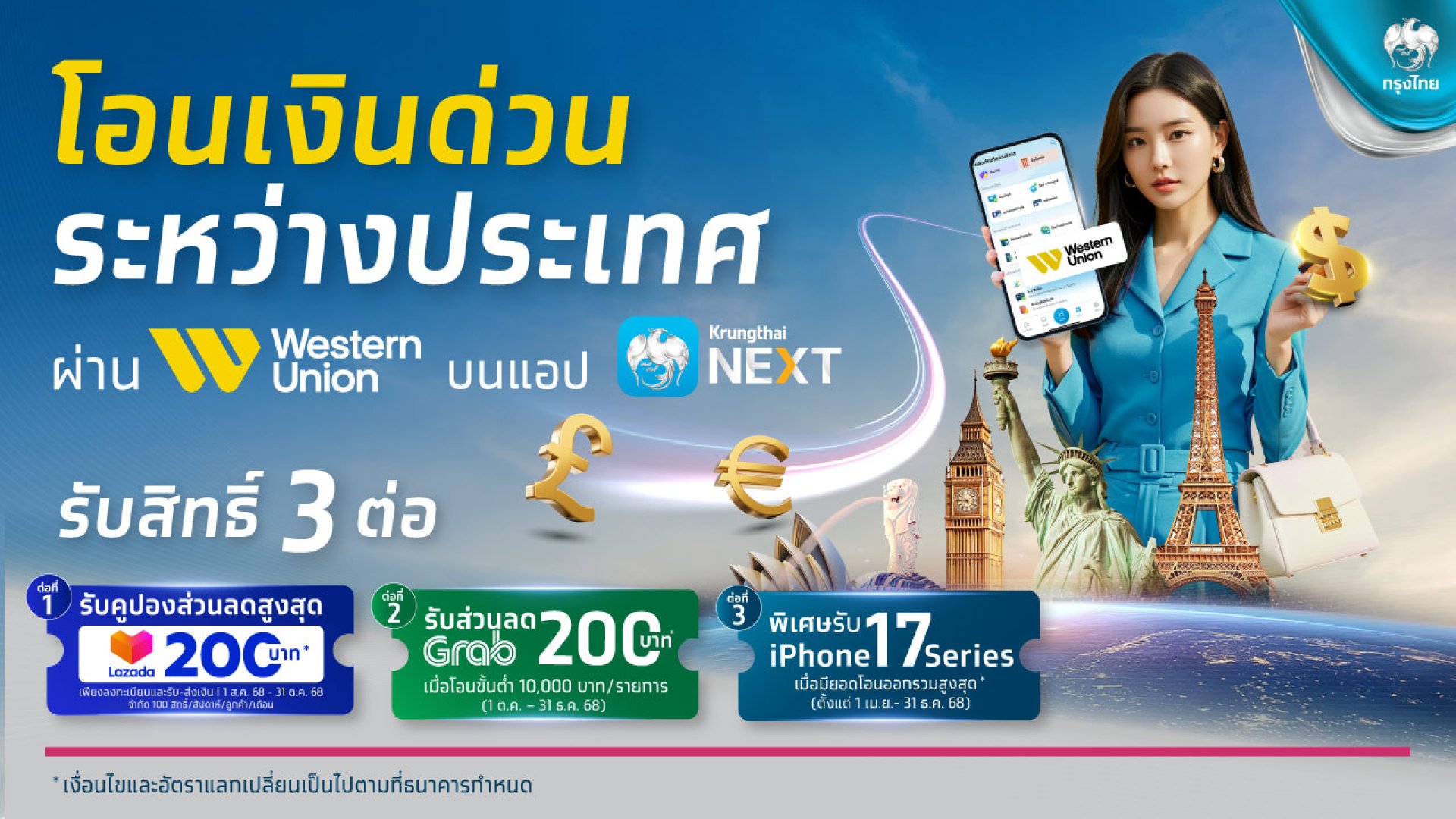 กรุงไทยปล่อยโปรฯ คุ้ม 3 ต่อ โอนเงิน เวสเทิร์น ยูเนี่ยน รับส่วนลด Lazada และ Grab พร้อมลุ้นรับ iPhone 17 Series