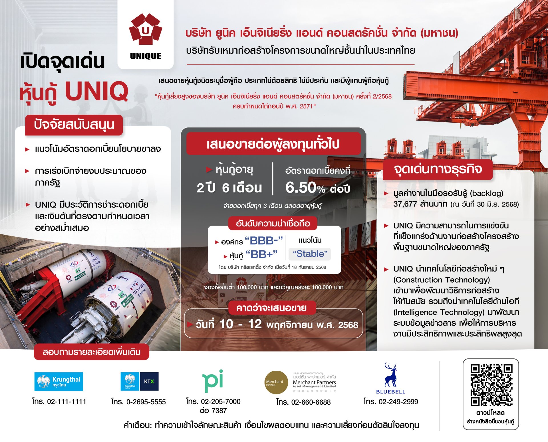 หุ้นกู้ UNIQ กระแสแรง! อายุ 2 ปี 6 เดือน ดอกเบี้ยคงที่ 6.50% ต่อปี ธุรกิจมั่นคงด้วยมูลค่างานในมือรอรับรู้ 3.7 หมื่นล้านบาท คาดเสนอขายระหว่าง 10 - 12 พ.ย. 2568 ผ่าน 5 สถาบันการเงิน