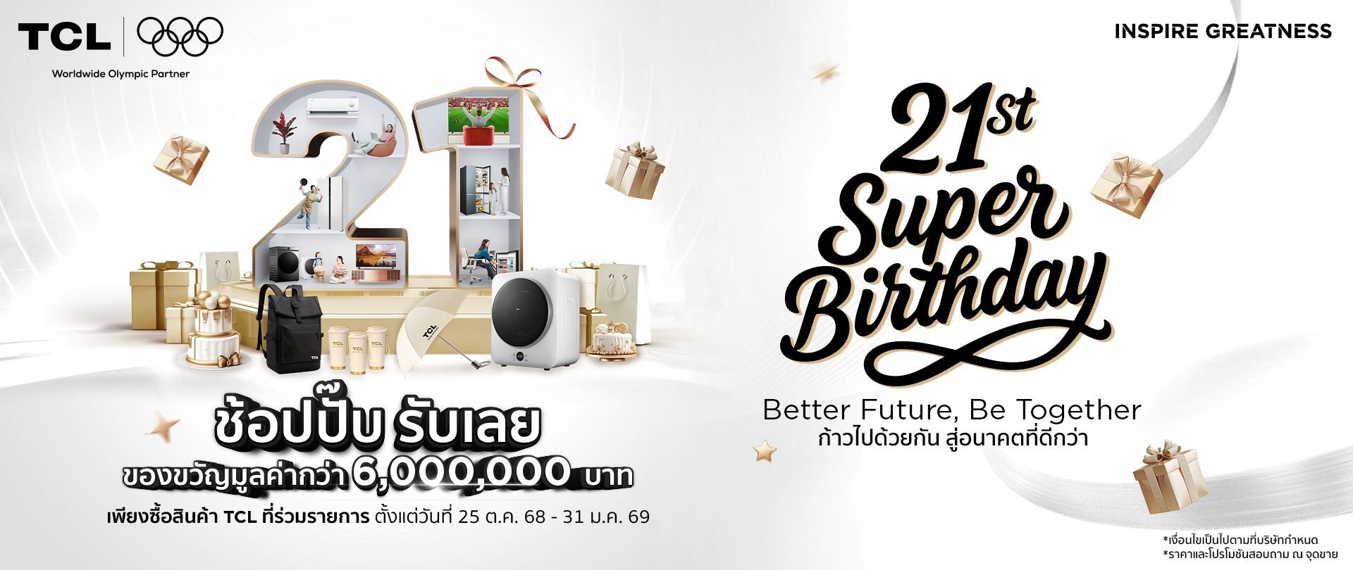 TCL จัดงานฉลองครบรอบ 21 ปี สุดปัง เปิดแคมเปญ 21st Super Birthday | Better Future, Be Together ก้าวไปด้วยกัน สู่อนาคตที่ดีกว่า คืนกำไรลูกค้าครั้งใหญ่ แจกของขวัญมูลค่ารวมกว่า 6,000,000 บาท ช้อปปั๊บ รับเลย เริ่มตั้งแต่วันที่ 25 ต.ค. 68 31 ม.ค. 69 พิเศษ ซื้อ Mini LED TV รับฟรีเครื่องอบผ้า Mini Dryer มูลค่า 5,990 บาททันที พร้อมกิจกรรม Super Star Content สุดยอด Content Creator ตัวจริงชิงรางวัลรวม 42 รางวัล มูลค่ารวมกว่า 480,000 บาท ตั้งแต่วันที่ 1 พ.ย. 2568 5 ม.ค. 2569 พร้อมเปิดตัว Super Start Up เฟ้นหา 21 ผู้ประกอบการรุ่นใหม่ ร่วมสร้างอนาคตที่ดีกว่า
