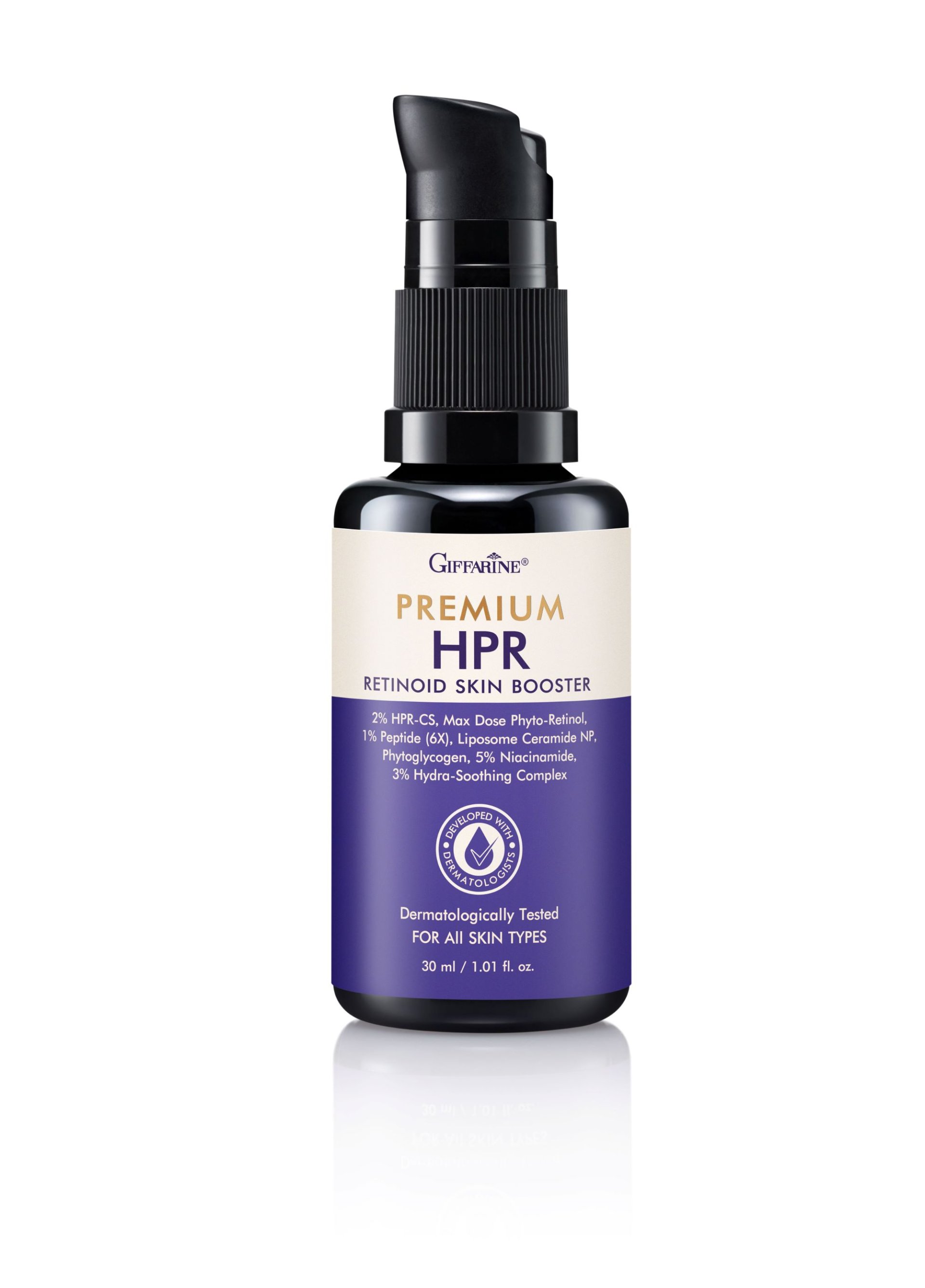 บริษัท กิฟฟารีน สกายไลน์ ยูนิตี้ จำกัด แนะนำไอเท็มเด็ด กิฟฟารีน พรีเมียม เอชพีอาร์ เรตินอยด์ สกิน บูสเตอร์ (Giffarine Premium HPR Retinoid Skin Booster) ผลิตภัณฑ์ใหม่ในกลุ่มผลิตภัณฑ์บำรุงผิวหน้า (Skin Care For Face) ที่เป็นพรีเมียม เอชพีอาร์ สูตร Effective Dose มีจุดเด่นในเรื่องของความอ่อนโยน แต่ทรงประสิทธิภาพ ด้วยนวัตกรรม Hybrid Retinoids สูตรลับเฉพาะของกิฟฟารีนที่ผสานการทำงานระหว่าง 2% HPR-CS (New Gen-Retinoid Complex Solution) ซึ่งเท่ากับ HPR เข้มข้น 0.2% และ Max Dose Phyto-Retinol เสริมสร้างการผลิตเซลล์ผิวตามธรรมชาติ โดยไม่ทำลายชั้นผิว พร้อมสารเสริมลดการระคายเคือง เช่น Liposome Ceramide NP , 3% Hydra-Soothing Complex ที่รวม Natural Hyaluron 100% & Cica & Natural Betaine & Panthenol ฟื้นบำรุงผิวให้เรียบเนียน ชุ่มชื้น แลดูกระจ่างใส ลดเลือนริ้วรอย ผิวแลดูตึงกระชับ เมื่อใช้ต่อเนื่อง เหมาะสำหรับกลุ่มคนอายุ 25-50 ปีขึ้นไปทั้งผู้หญิง ผู้ชาย กลุ่มคนที่เริ่มมีริ้วรอยหรือกังวลเรื่องริ้วรอยก่อนวัย กลุ่มคนที่ให้ความสำคัญกับการดูแลผิวอีกระดับ และกลุ่มผู้เริ่มต้นหรือมือใหม่หัดใช้เรตินอยด์ เป็นต้น ขนาด 30 มล. ราคา 780 บาท