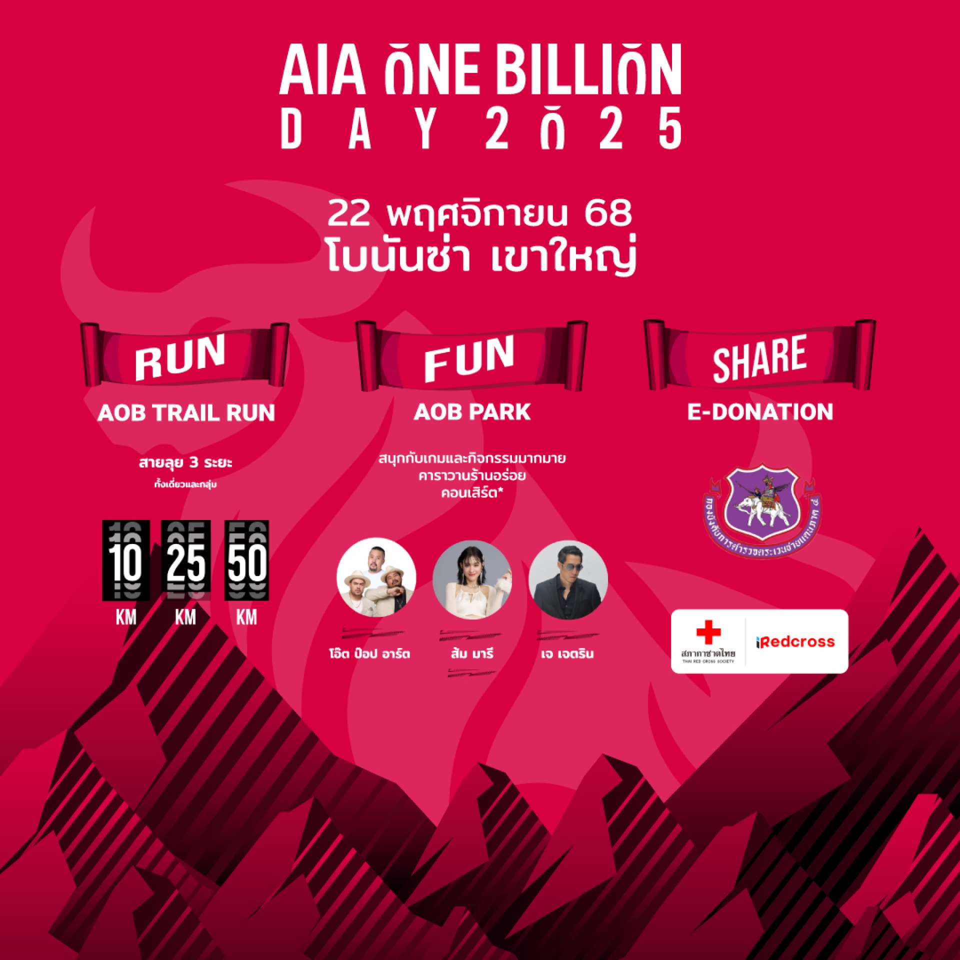 AIA ONE BILLION DAY 2025 เชิญชวนร่วมวิ่งเทรลสุดยิ่งใหญ่ ณ อุทยานแห่งชาติเขาใหญ่ ชิงถ้วยพระราชทานฯ พร้อมร่วม วิ่งเพื่อให้ เพื่อสุขภาพดีและสังคมยั่งยืน
