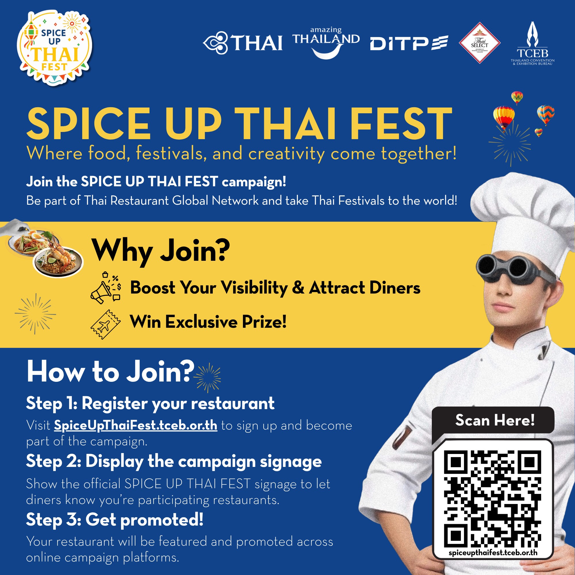 สำหรับแคมเปญ Spice Up Thai Fest ลูกค้าเพียงรับประทานอาหารที่ร้านอาหารไทยในต่างประเทศที่เข้าร่วมโครงการ พร้อมสแกน QR Code ณ ร้านอาหารที่เข้าร่วม เพื่อเข้าสู่แพลตฟอร์มออนไลน์ www.SpiceUpThaiFest.tceb.or.th และร่วมกิจกรรมโดยถ่ายภาพพร้อมบรรยายความรู้สึกกับอาหารไทยและอัตลักษณ์ความเป็นไทย และเช็คอินบนแพลตฟอร์ม ก็มีโอกาสได้รับตั๋วเครื่องบินไป-กลับจากสายการบินไทย รวมกว่า 55 รางวัล เพื่อมาร่วมสัมผัสประสบการณ์งานเฟสติวัลไทยในประเทศไทย โดยสามารถร่วมกิจกรรมได้ตั้งแต่วันที่ 15 พฤศจิกายน 2568 18 มกราคม 2569 พร้อมประกาศผู้ได้รับรางวัลบนแพลตฟอร์มในวันที่ 22 มกราคม 2569 สามารถติดตามรายละเอียดแคมเปญได้ที่ www.SpiceUpThaiFest.tceb.or.th
