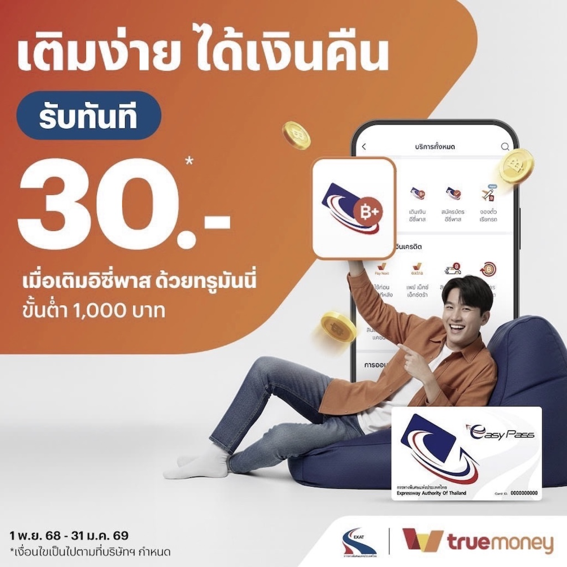 การทางพิเศษแห่งประเทศไทย (กทพ.) กระทรวงคมนาคม ร่วมกับ บริษัท ทรูมันนี่ จำกัด จัดโครงการ EXAT x TrueMoney ระหว่างวันที่ 1 พฤศจิกายน 2568 - 31 มกราคม 2569 เมื่อสมัครบัตร Easy Pass ผ่านทรูมันนี่ ได้รับเงินคืน 52 บาท (จำกัด 1 สิทธิ์ ต่อ 1 หมายเลขบัตรประชาชน) จำนวน 25,000 สิทธิ ตลอดระยะเวลาแคมเปญ หรือเติมเงินบัตร Easy Pass ผ่านทรูมันนี่ ขั้นต่ำ 1,000 บาท รับเงินคืนเข้าทรูมันนี่ 30 บาท (จำกัด 1 สิทธิ์ ต่อ 1 หมายเลขบัตรประชาชน) จำนวน 32,000 สิทธิ์ตลอดระยะเวลาแคมเปญ
