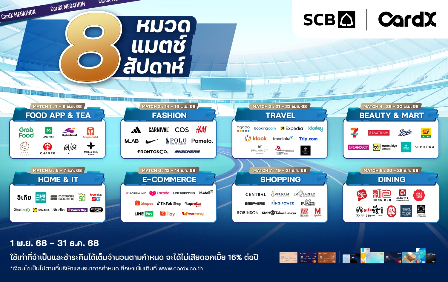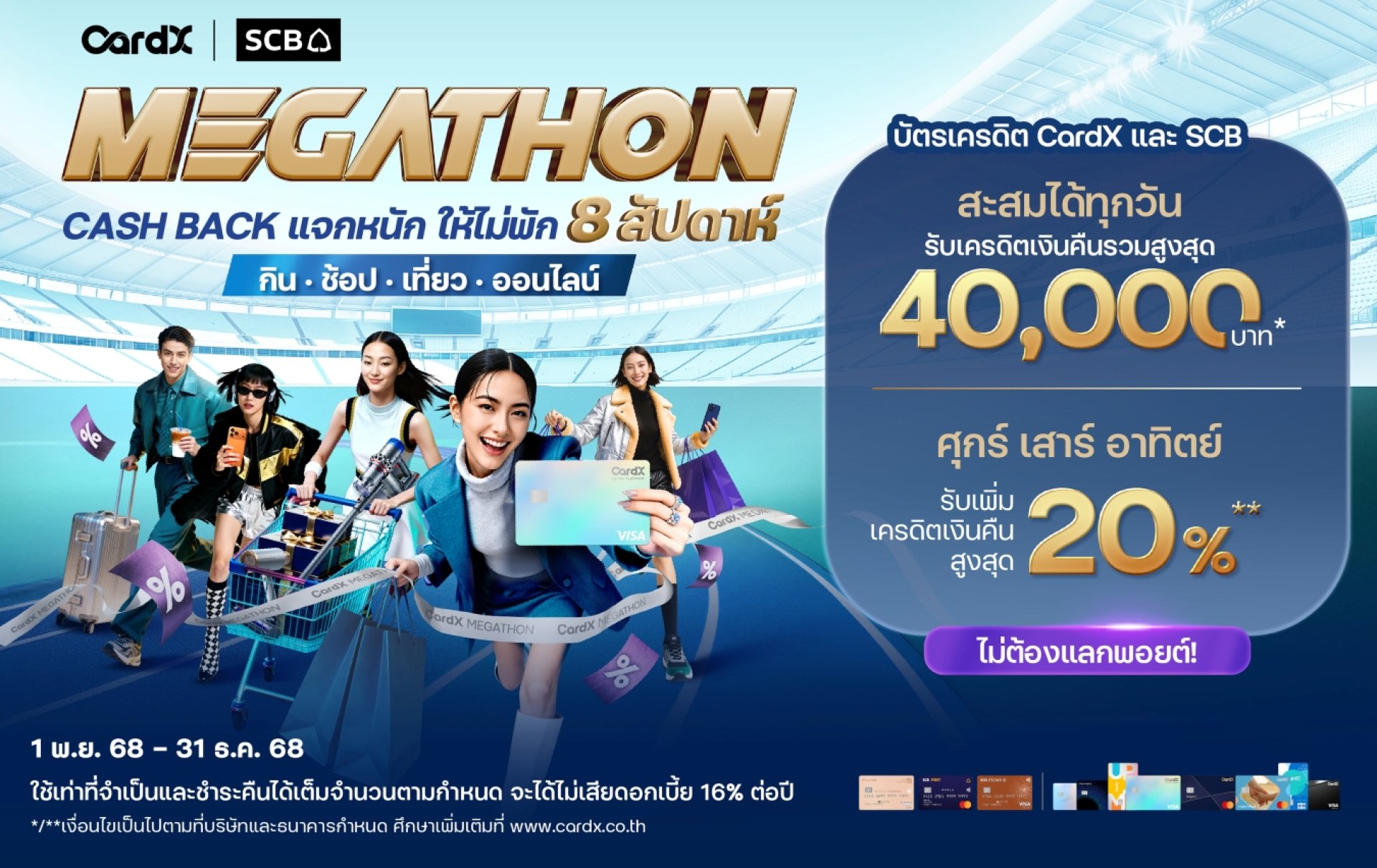 CardX ผู้ให้บริการบัตรเครดิตและสินเชื่อบุคคลภายใต้กลุ่มเอสซีบีเอกซ์ ตอบรับ เทรนด์การใช้จ่ายผ่านบัตรของคนไทยในปี 2568 ที่เติบโตโดดเด่นใน 4 หมวดหลัก ได้แก่ กิน-ช้อปปิ้ง-ท่องเที่ยว-ออนไลน์ สะท้อนพฤติกรรมผู้บริโภคที่มุ่งใช้จ่ายเพื่อความสุขและคุณภาพชีวิตที่จับต้องได้ ด้วยการส่งแคมเปญใหญ่ MEGATHON รวมตัวแบรนด์ดัง แจกหนักไม่พัก คุ้มดับเบิ้ลตลอด 8 สัปดาห์ พร้อมมอบเครดิตเงินคืนรวมสูงสุด 42,500 บาท*/** โดยไม่ต้องใช้พอยต์แลก ตั้งแต่วันที่ 1 พฤศจิกายน 31 ธันวาคม 2568