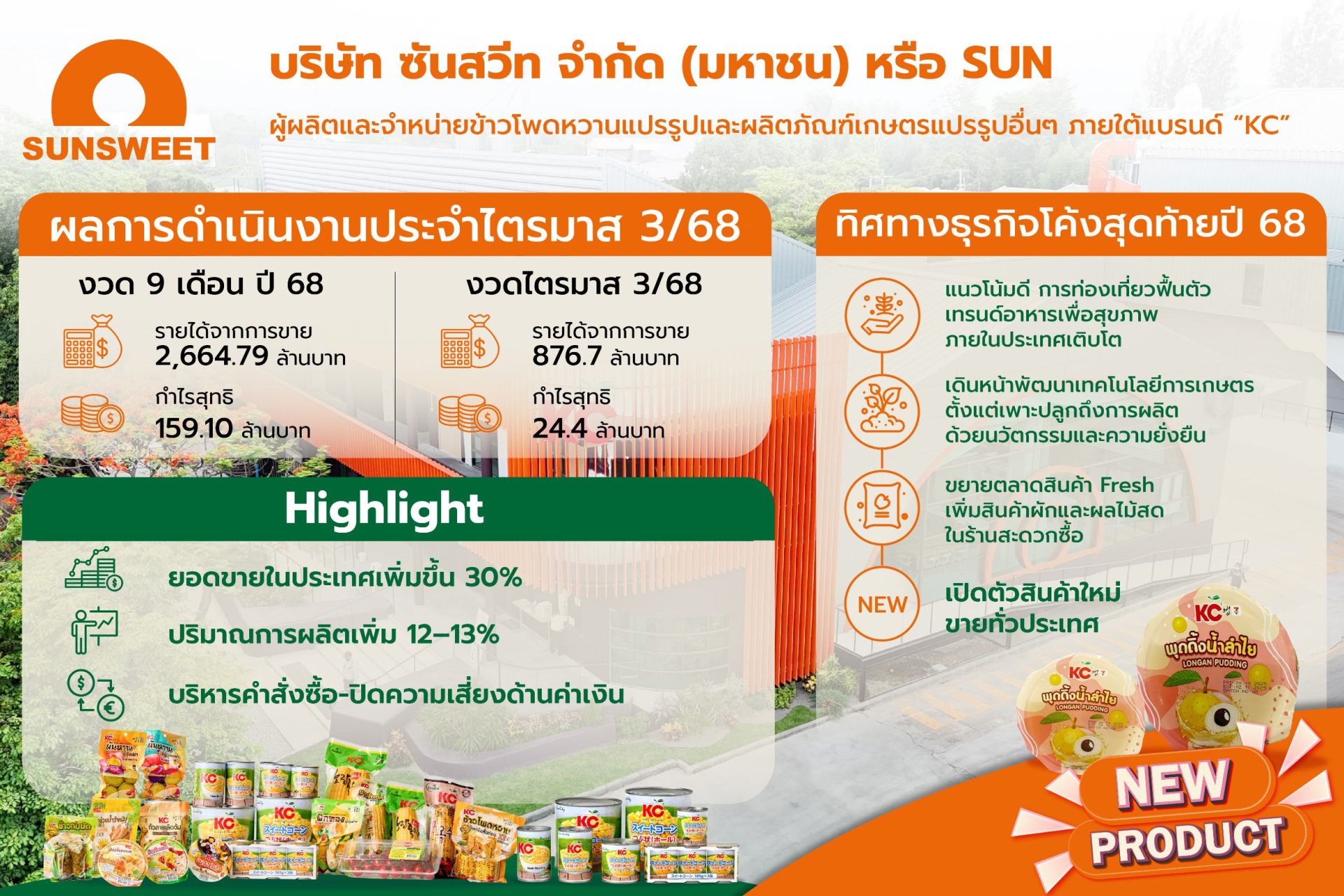 SUN เดินหน้าธุรกิจช่วงโค้งท้ายปี 2568 ปริมาณคำสั่งซื้อทั้งในประเทศและต่างประเทศกว่า 2,000 ตู้ รับดีมานด์การท่องเที่ยวฟื้นตัวและเทรนด์ผู้บริโภคอาหารเพื่อสุขภาพโต พร้อมบริหารความเสี่ยงด้านค่าเงินผันผวนจากเศรษฐกิจโลก พัฒนาเทคโนโลยีการผลิต เตรียมเปิดตัวผลิตภัณฑ์ใหม่ พุดดิ้งน้ำลำไย ภายใต้แบรนด์ KC ขยายโอกาสทางการตลาดทั่วประเทศ ด้านผลประกอบการงวด 9 เดือนปี 2568 รายได้จากการขาย 2,664.79 ล้านบาท กำไรสุทธิ 159.10 ล้านบาท