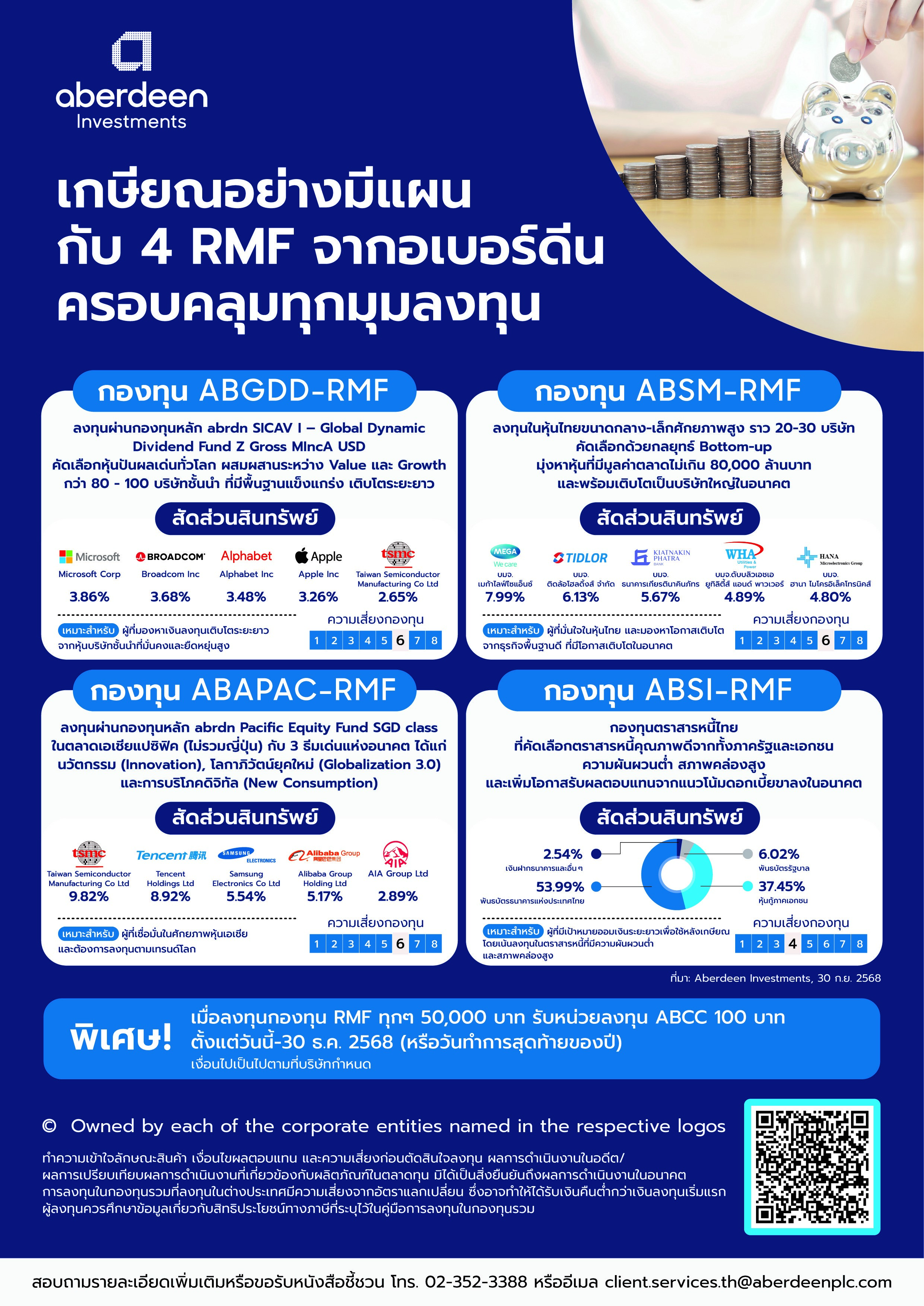 พิเศษ! สำหรับผู้ลงทุนที่ลงทุนในกองทุนประเภท RMF ที่ร่วมรายการกับอเบอร์ดีน ทุกยอดการลงทุน 50,000 บาท ผู้ลงทุนจะได้รับหน่วยลงทุนกองทุนเปิด อเบอร์ดีน แคช ครีเอชั่น (ABCC) มูลค่า 100 บาท ตั้งแต่วันนี้ ถึง 30 ธันวาคม 2568 (หรือวันทำการสุดท้ายของปี) ทั้งนี้ เงื่อนไขเป็นไปตามที่บริษัทกำหนด